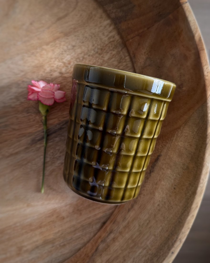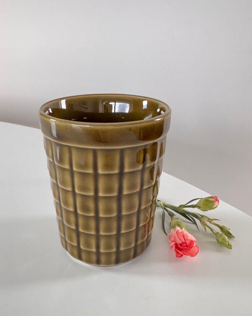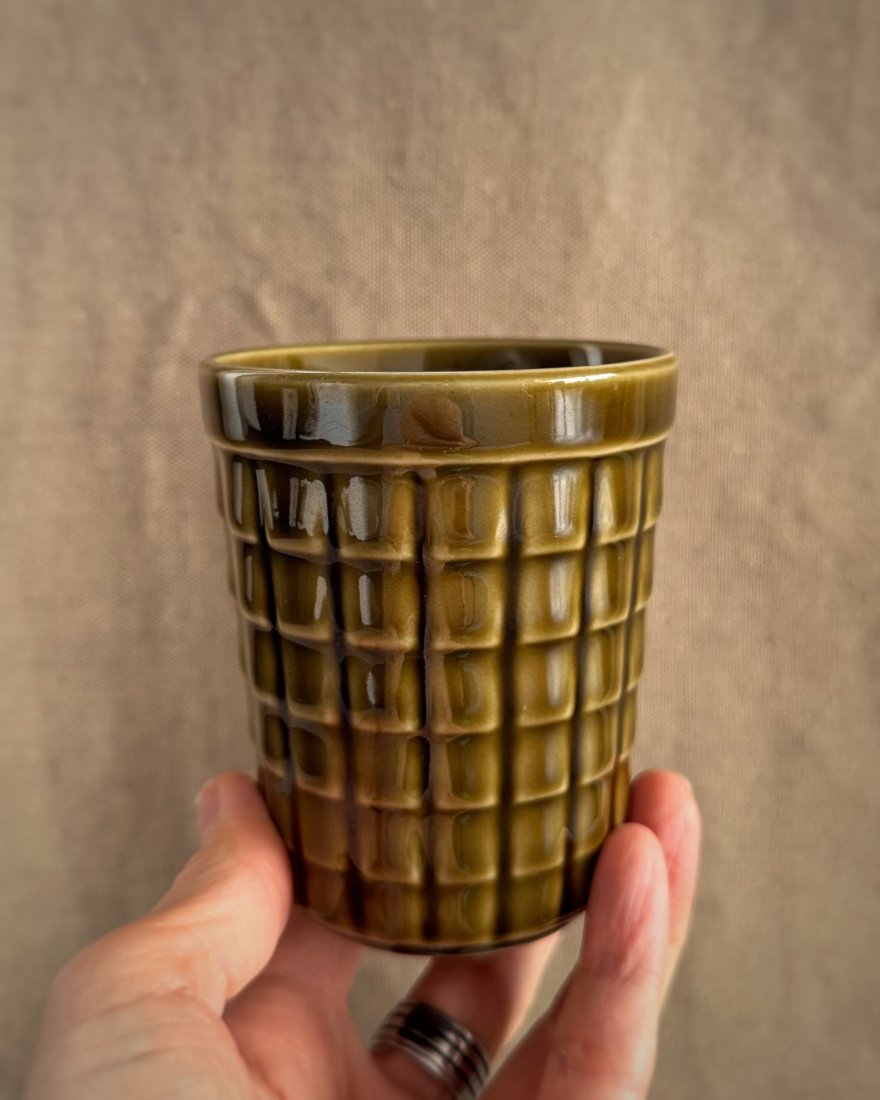 Kubek Irena w kolorze zieleni oliwkowej zaprojektowany przez Janinę Asłanowicz, z charakterystyczną kratką.