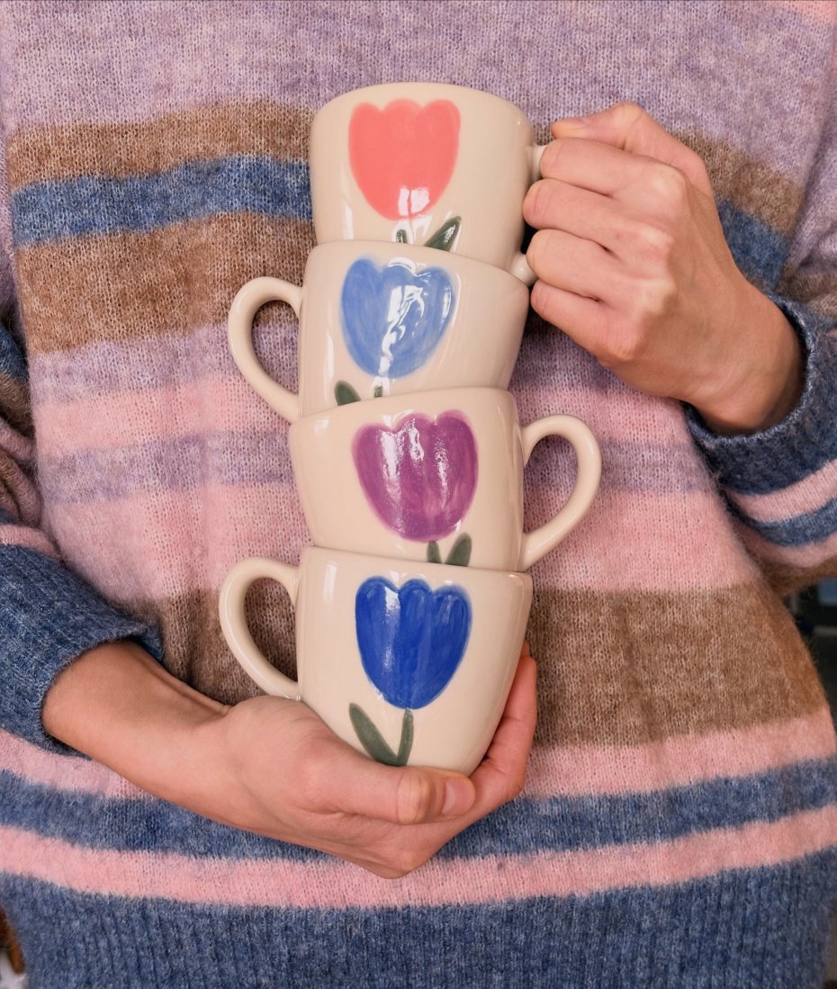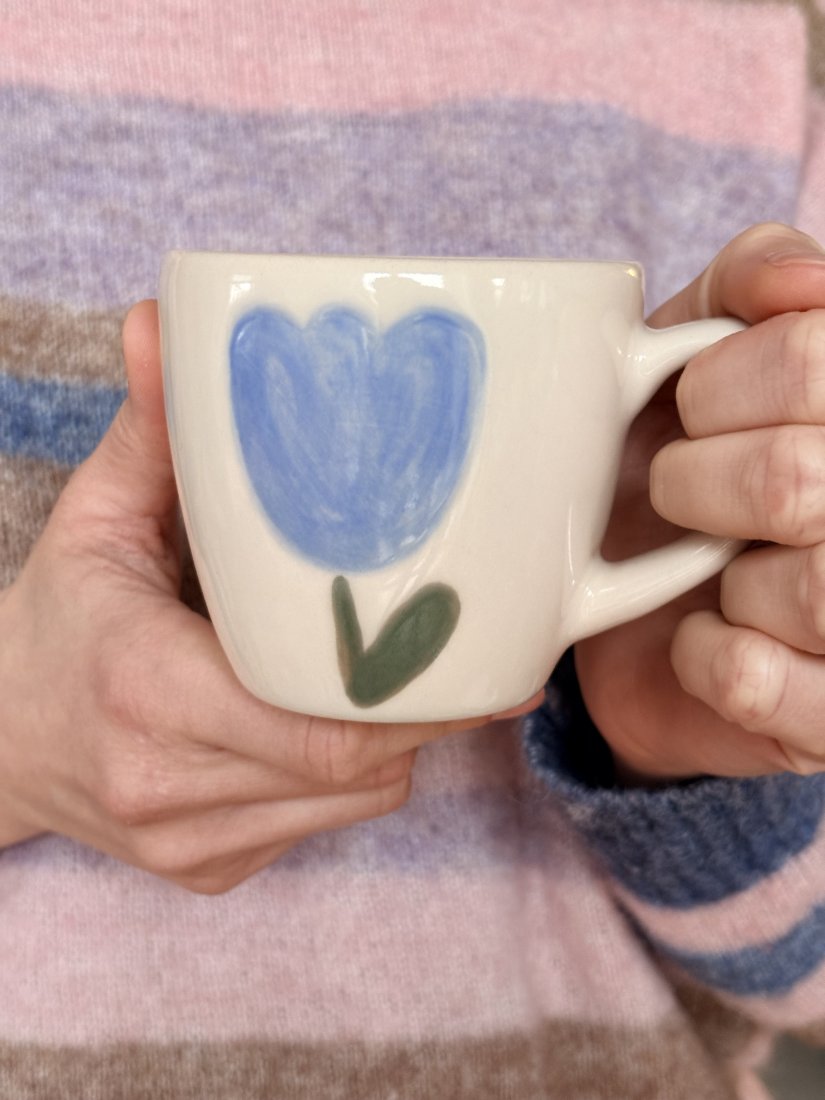 Kubek z niebieskim tulipanem został pomalowany i poszkliwiony ręcznie. Wypalony w piecu dwukrotnie, najpierw na biskwit, następnie na ostro. Użyte farby oraz szkliwo posiadają certyfikat do kontaktu z żywnością. Można myć w zmywarce. Pojemność kubka to 220 ml.