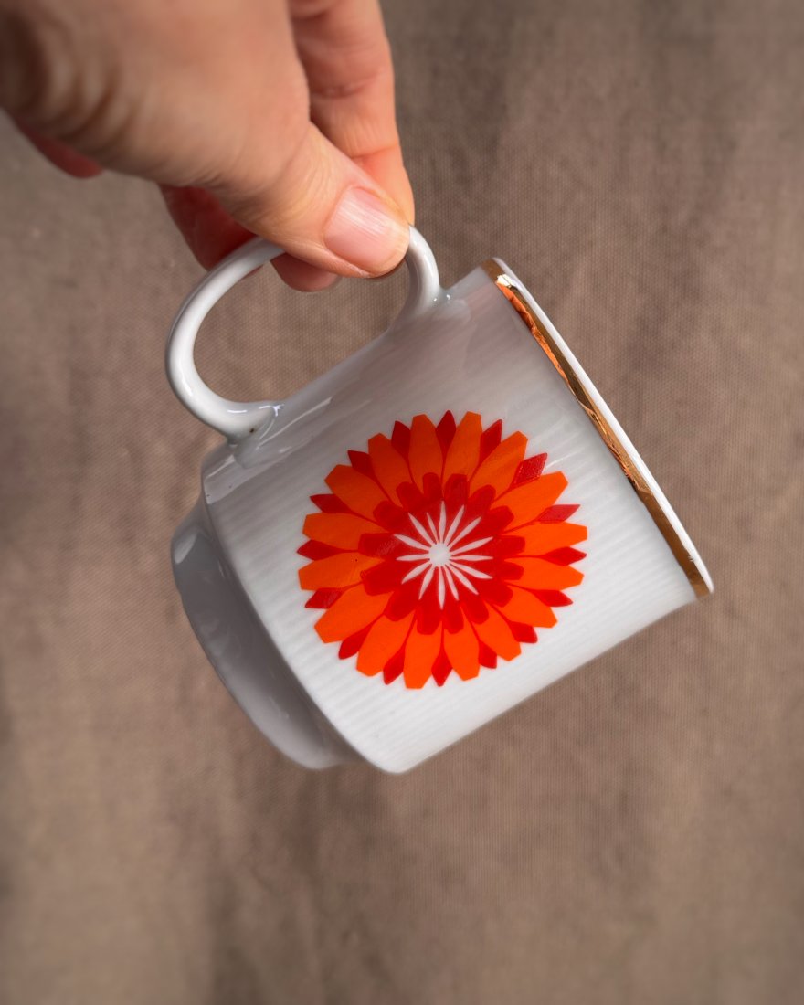 Kubek porcelanowy vintage z ozdobnymi kalkomaniami i złoceniami.