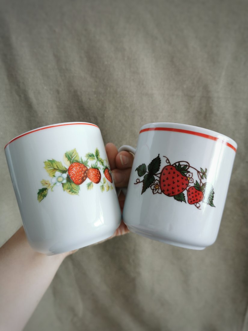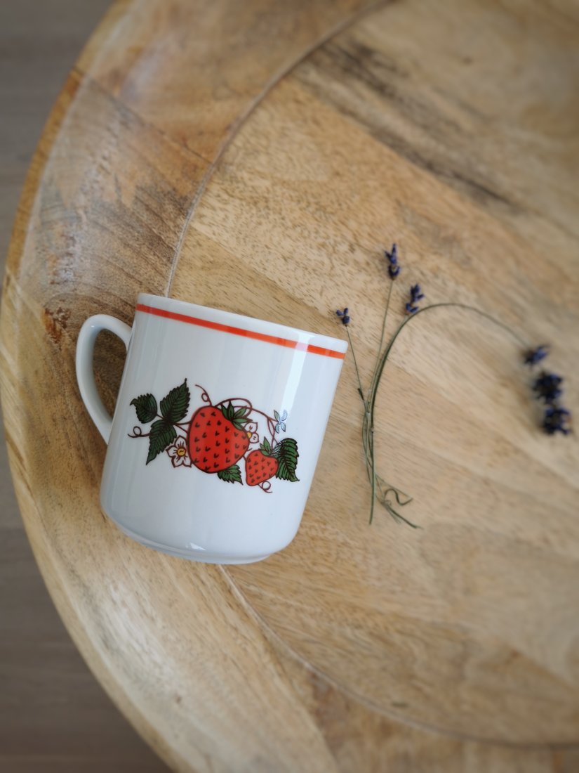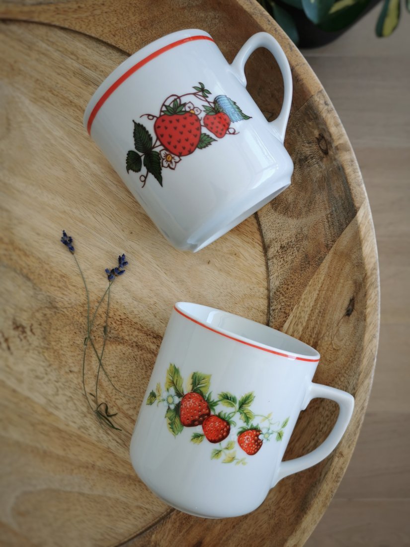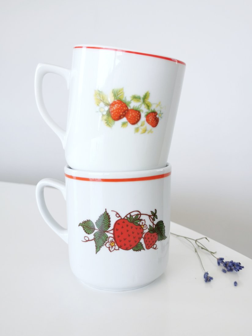 Kubek biały z uchwytem dekorowany dwustronnie trwałą kalkomanią w dwie truskawki i czerwonym paseczkiem wokół rantu.