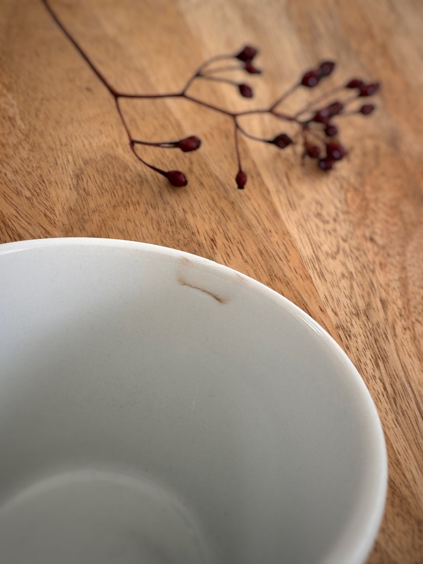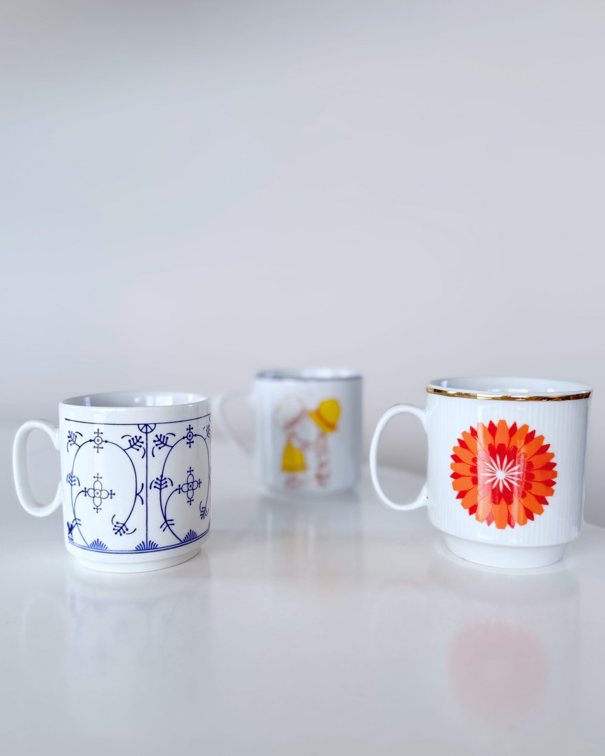 Kubek porcelanowy vintage z ozdobnymi kalkomaniami we wzór słomkowy.