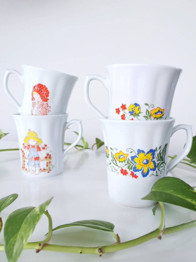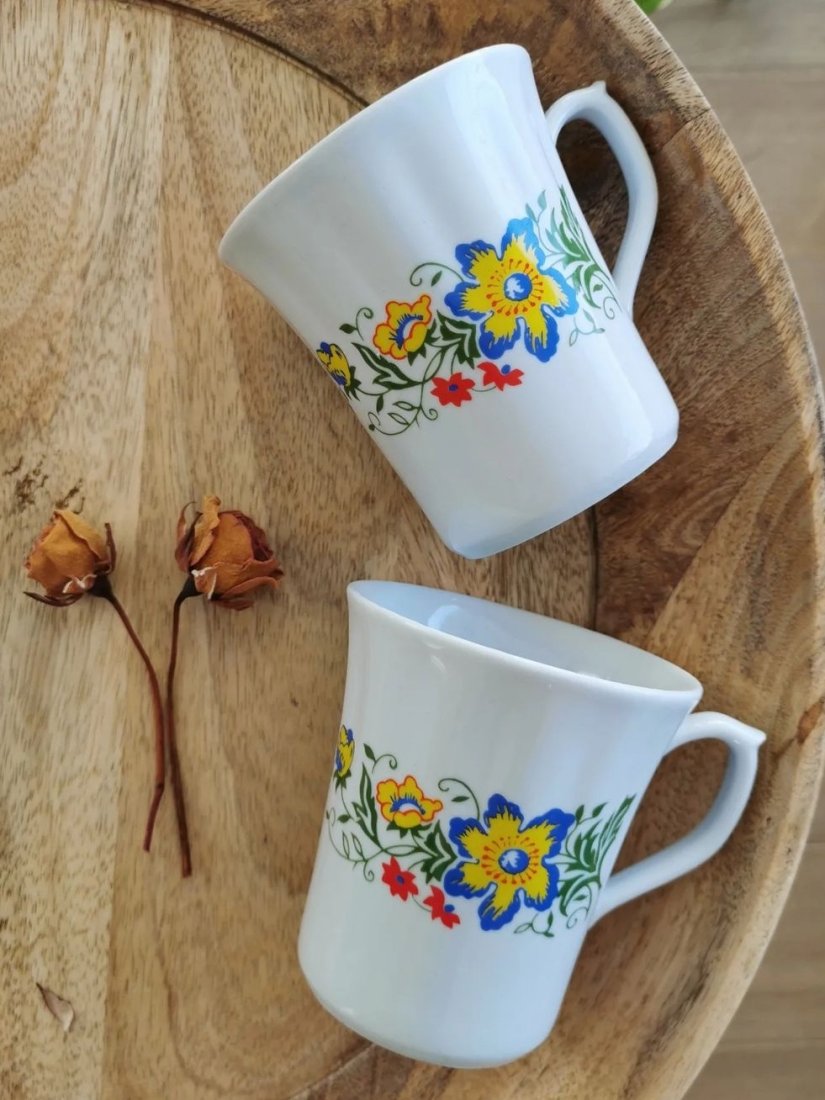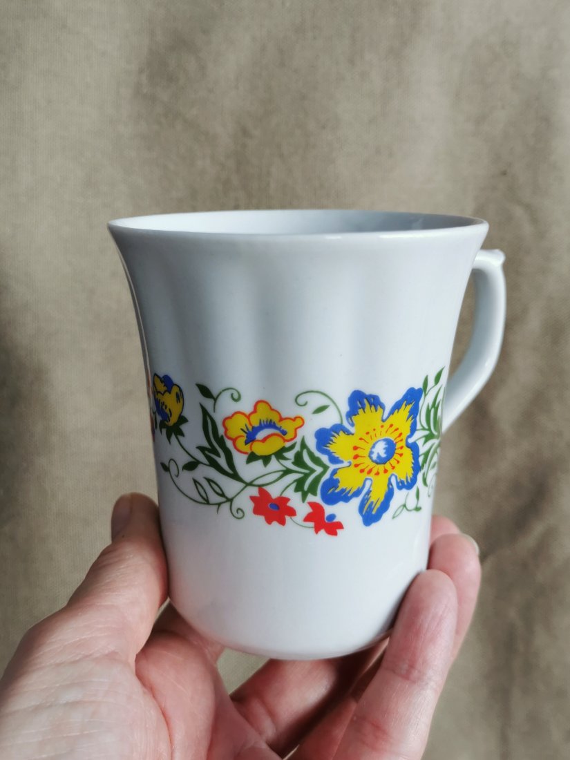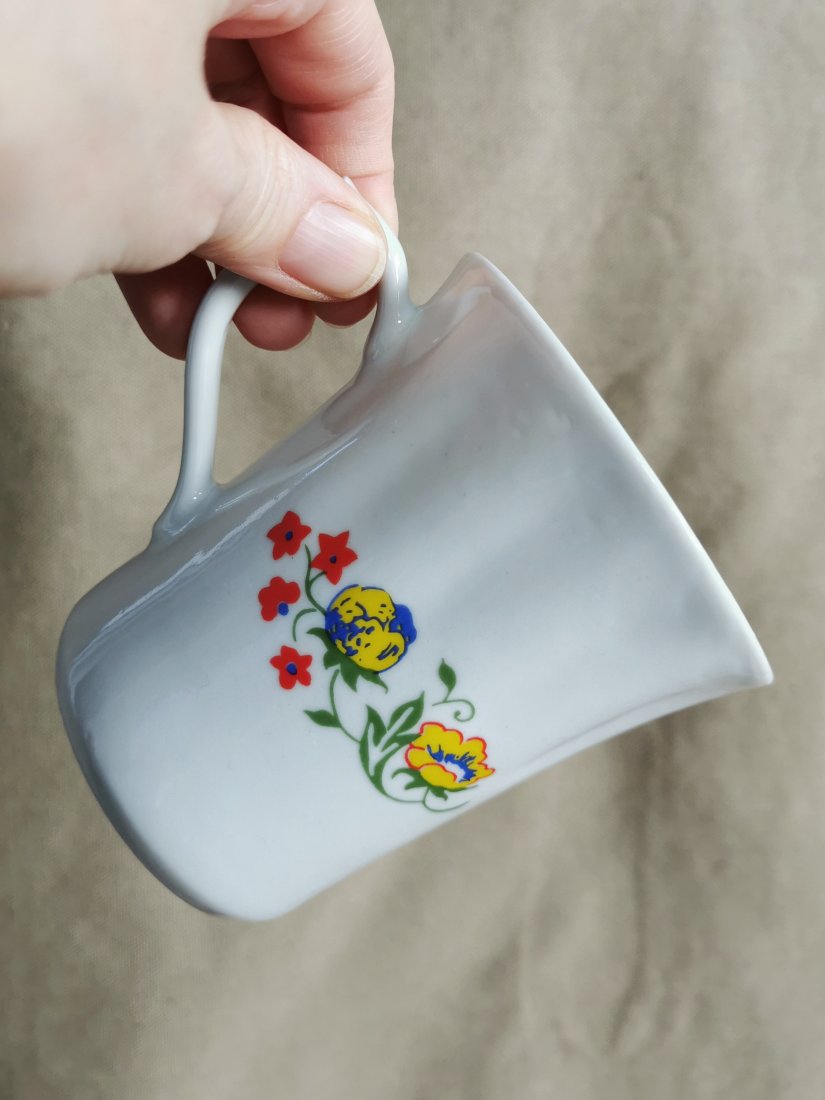 Kubek porcelanowy z uchwytem, zdobiony dwustronnie kolorowymi kalkomaniami w kwiatki.