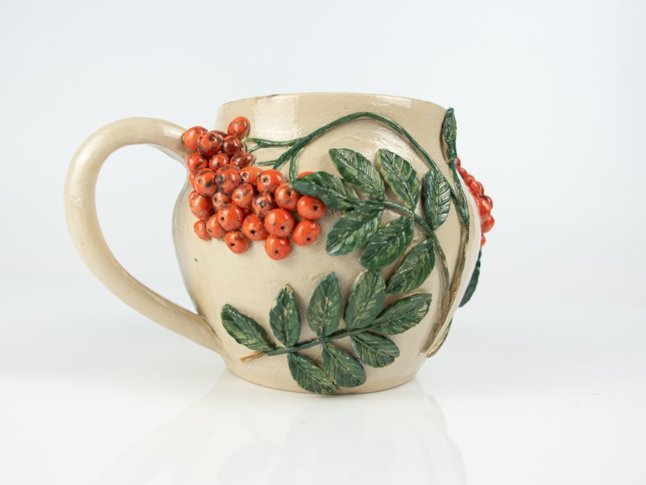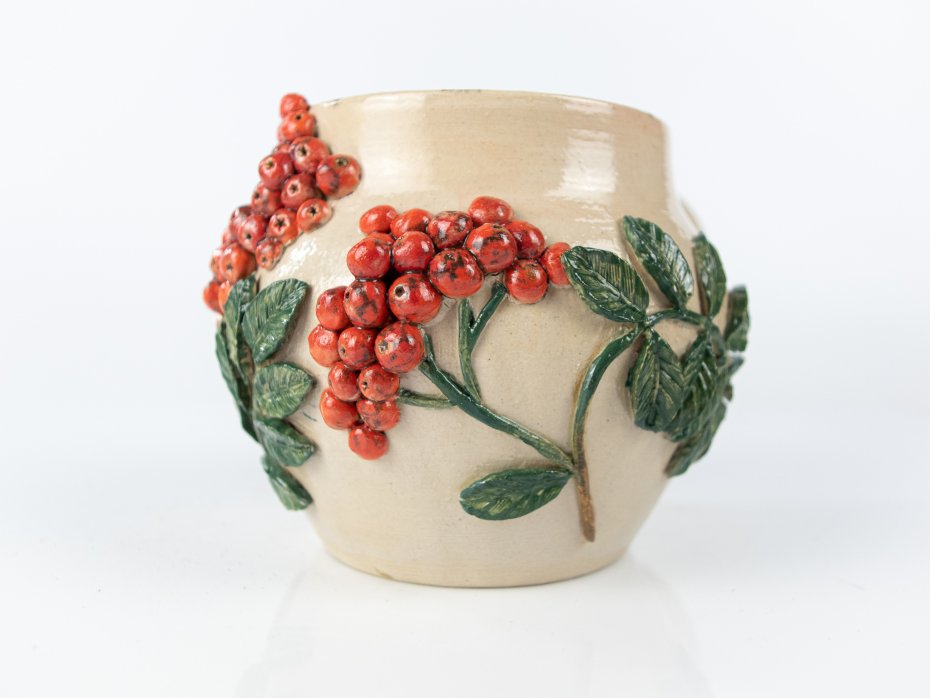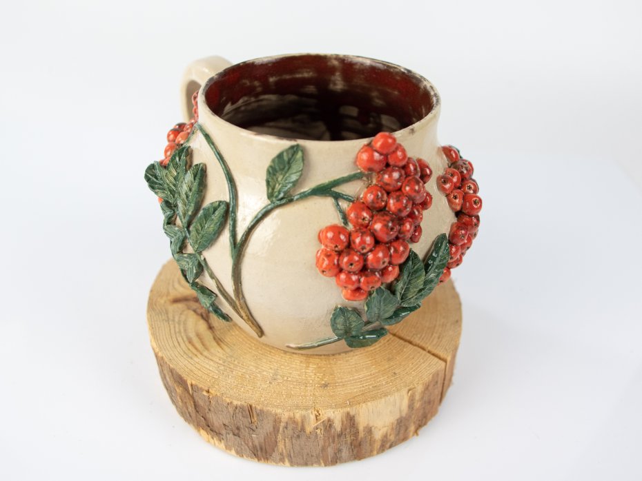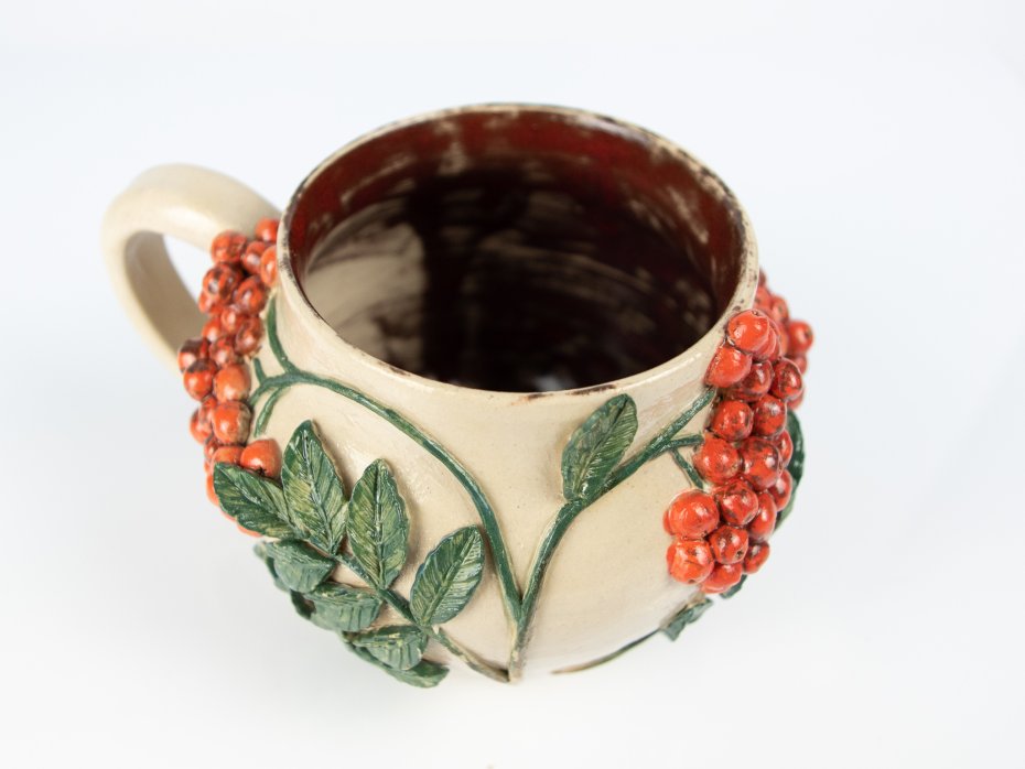 Kubek ceramiczny "Jarzębina" został wykonany w całości ręcznie – baza wytoczona na kole garncarskim, a następnie ozdobiona gałązkami jarzębiny. Wnętrze kubka pokryte jest wyrazistym szkliwem w odcieniach pomarańczowo-czerwonych z subtelnymi białymi przebarwieniami. Zewnętrzna powierzchnia zabezpieczona została przezroczystym szkliwem, które podkreśla naturalną barwę gliny i detale dekoracji. To unikatowy, użytkowy przedmiot inspirowany naturą, idealny na prezent lub do codziennego użytku.