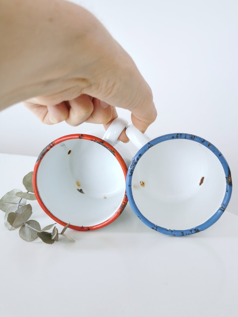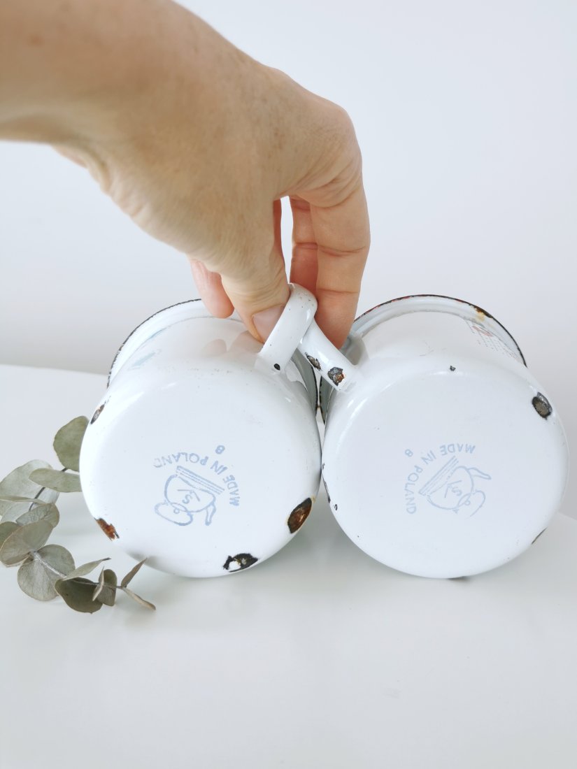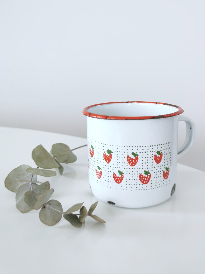 Metalowy emaliowany kubek idealny do wiejskiego domku.