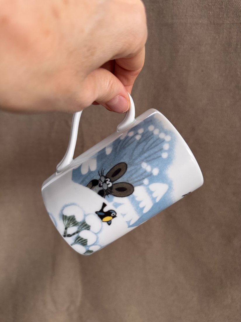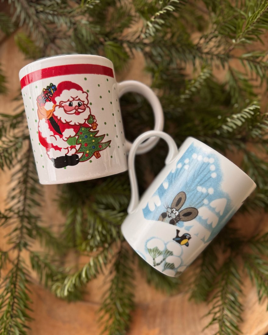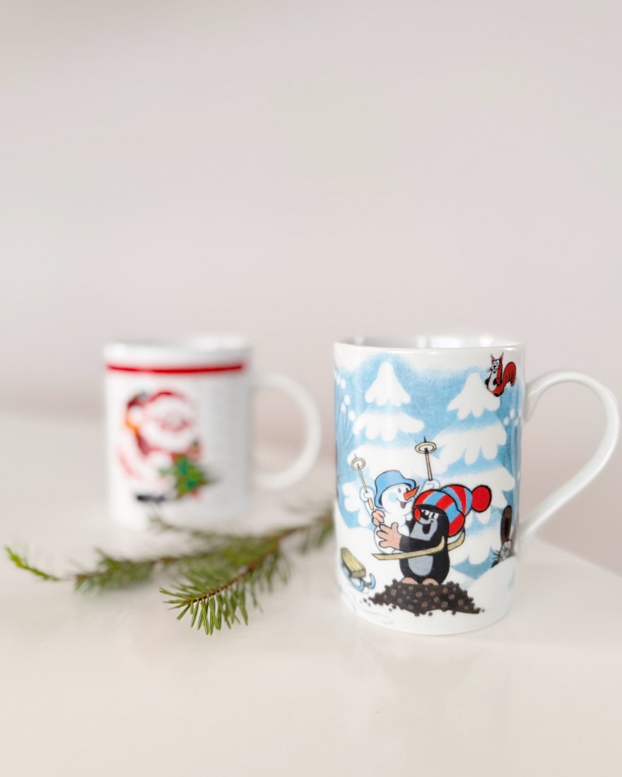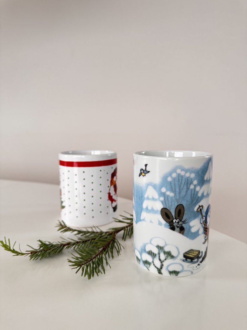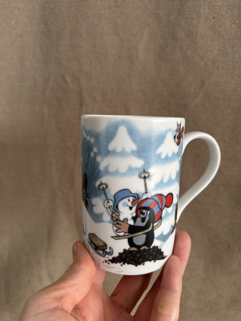 Kubek z Krecikiem i przyjaciółmi w zimowej scenerii.