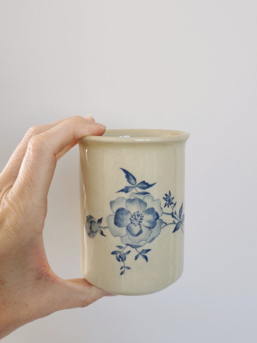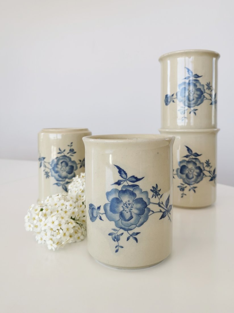 Dwa kubki Tułowice w kolorze szarym zdobione dwustronnie trwałą kalkomanią w kolorze niebieskim w kwiaty.