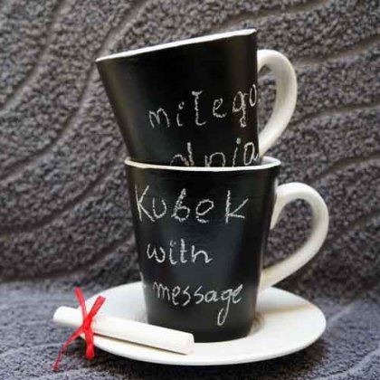 Witam, kubki with a message to coffee mugs, które stanowią świetne medium komunikacji krótkich jakże ważnych czasem myśli bądź wiadomości o których rano jest bardzo łatwo zapomnieć. Przedmiotem sprzedaży są dwa kubki (bez talerzyka) pokryte specjalną folią tablicową. Do zestawu dołączona jest kreda. Sposób użycia: na kubku napisz wiadomość kredą a potem wytrzyj szmatką. Polecam :)