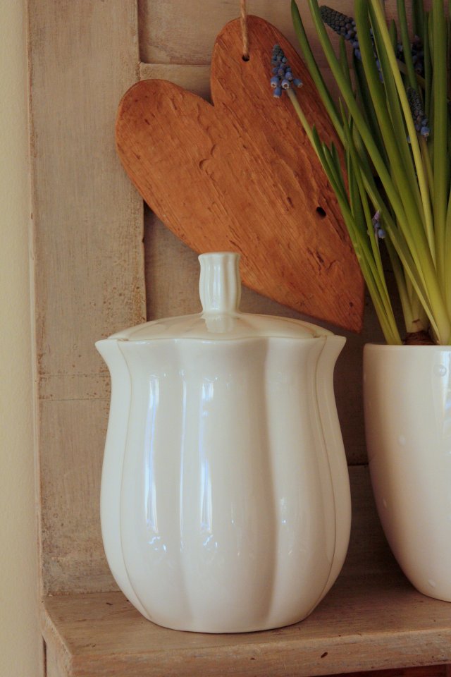 Uroczy biały ceramiczny pojemnik z przykrywką. O bardzo ciekawym kształcie!