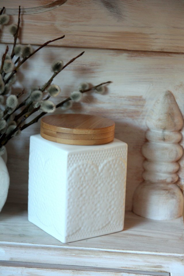 Uroczy biały ceramiczny pojemnik z drewnianą przykrywką. Z ciekawymi zdobieniami...ala koronka:)