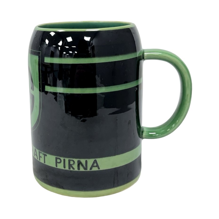 Oryginalny ceramiczny kufel wykonany w manufakturze Hedwig Bollhagen (HB), jednej z najważniejszych i najbardziej cenionych wytwórni ceramiki artystycznej w powojennych Niemczech. Egzemplarz pochodzi z okresu NRD i wyróżnia się wyrazistą, kontrastową dekoracją w kolorach czerni i zieleni oraz typową dla HB prostą, graficzną estetyką inspirowaną modernizmem i Bauhausem.
