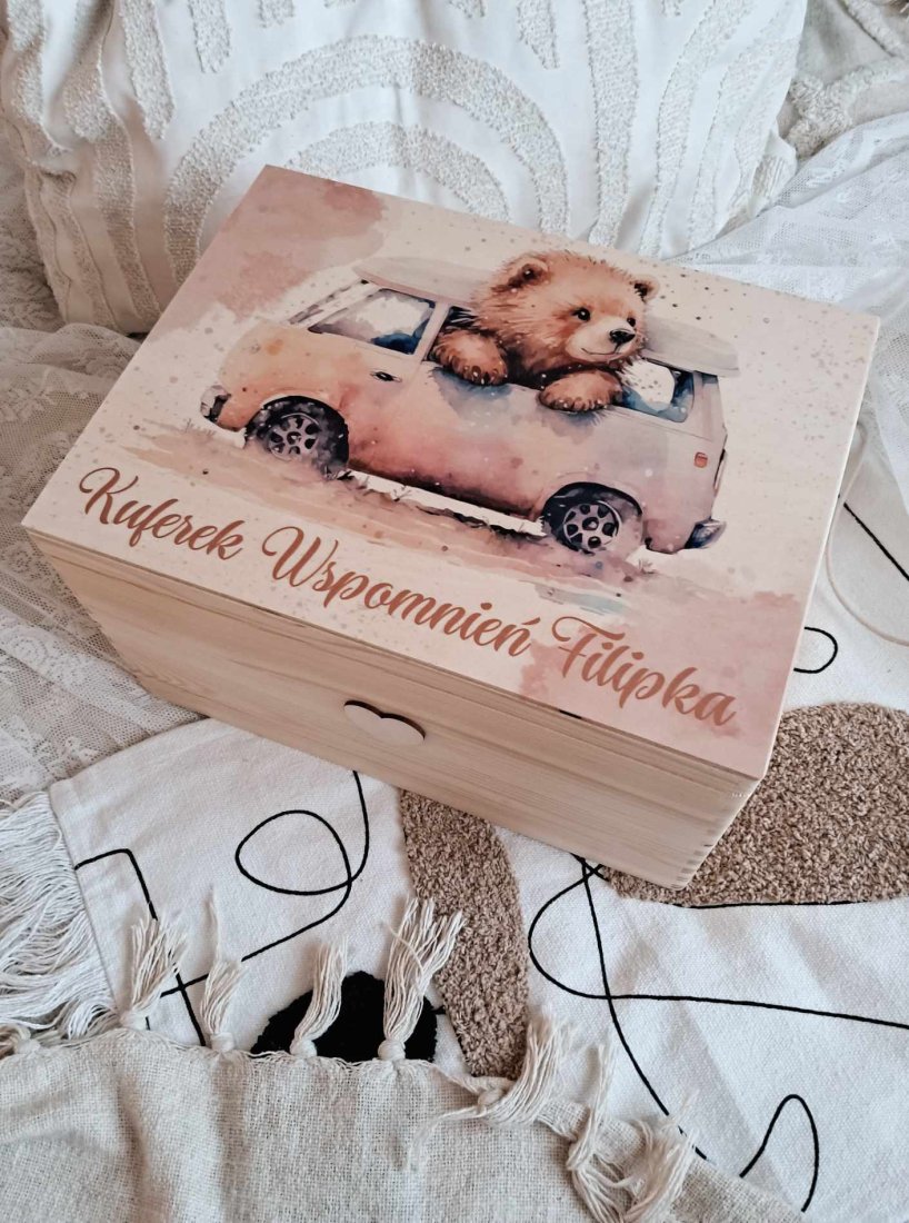 Przepiękny i wyjątkowy kuferek wspomnień z przepiękną grafiką. To idealny pomysł na pamiątkę chrztu, roczku czy urodzin. To pudełko skrzynka będzie świetnym pomysłem na prezent z okazji narodzin czy babyshower.