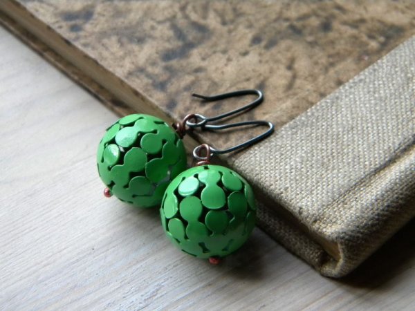 kolczyki wykonane ze stalowych,emaliowanych kul zawieszonych na miedzianych szpilkach.zawieszki z oksydowanego srebra. kulka o srednicy 1,8cm. dlugosc kolczykow 4cm.