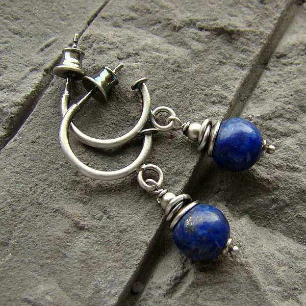 Proste, minimalistyczne kolczyki na co dzień. Wykonane w całości z oksydowanego srebra próby 925 oraz gładkich kulek lapisu lazuli wielkości ok. 0,8 cm.. Długość całkowita to 3,3 cm. Bigle typu sztyft w formie półkola. Zatyczki w srodku z silikonem dzięki czemu bardzo dobrze trzymaja sztyft. Ozdobnie zapakowane.