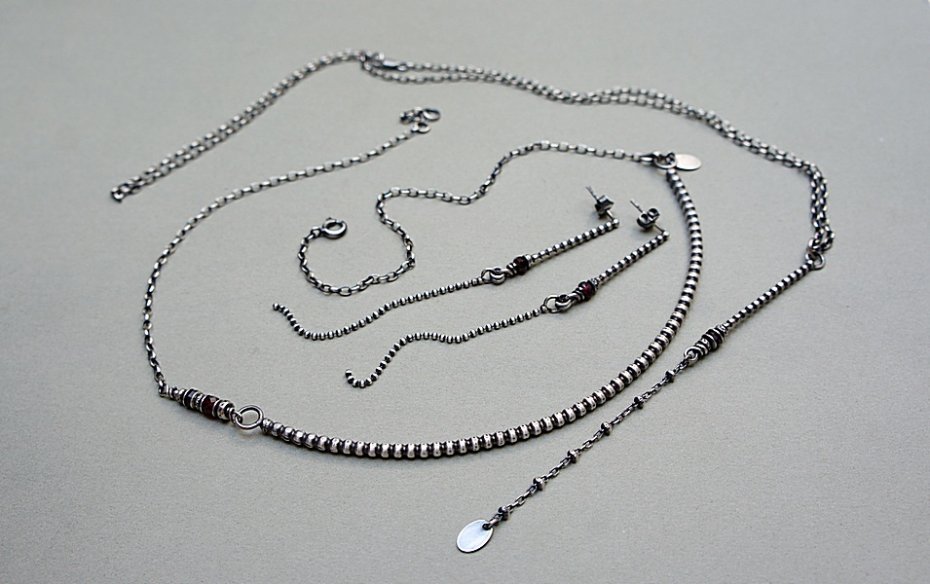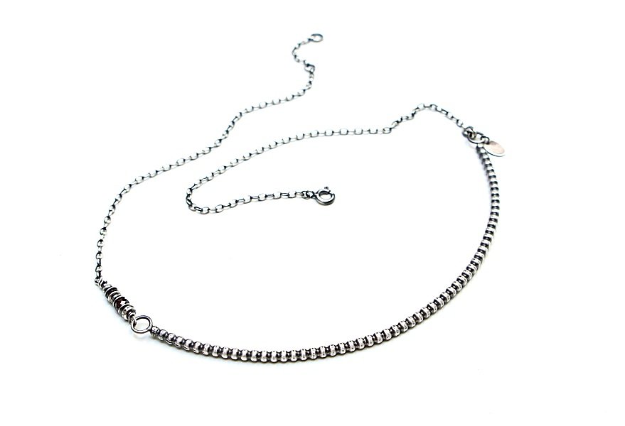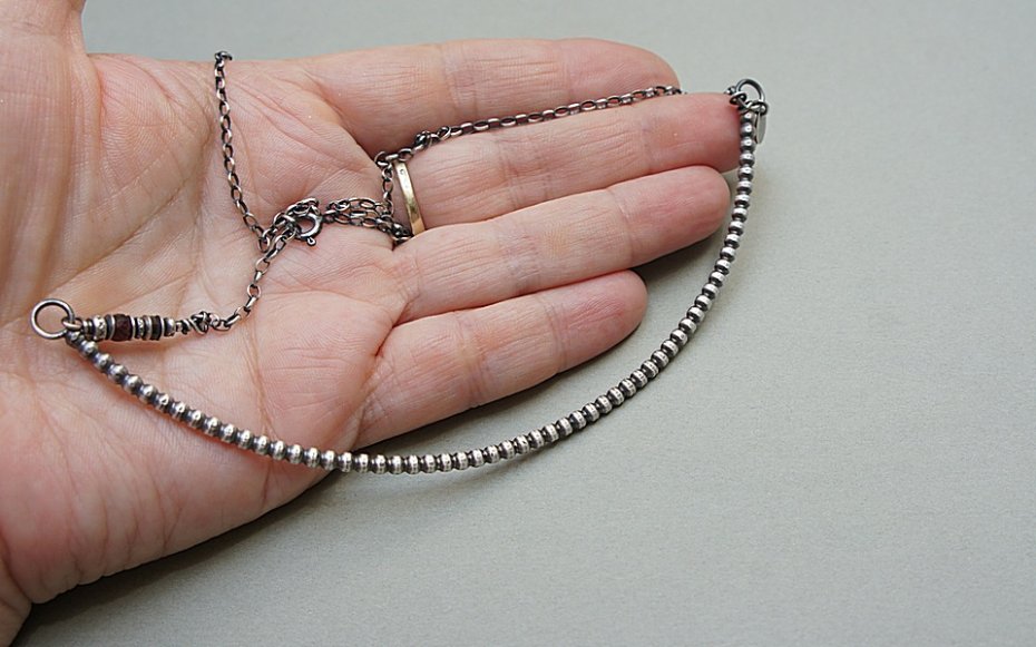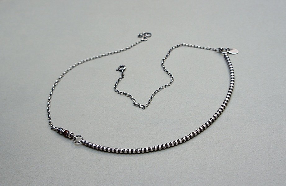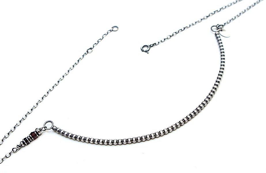 Krótki naszyjnik wykonany własnoręcznie ze srebra [pr. 925] z kulkowego drutu / wielkość kuleczek 3mm] w połączeniu z fasetowanym granatem] [4 mm] .Długość łuku [ok. 17cm]. Całość oksydowana i przetarta. Całkowita długość naszyjnika około 51cm.