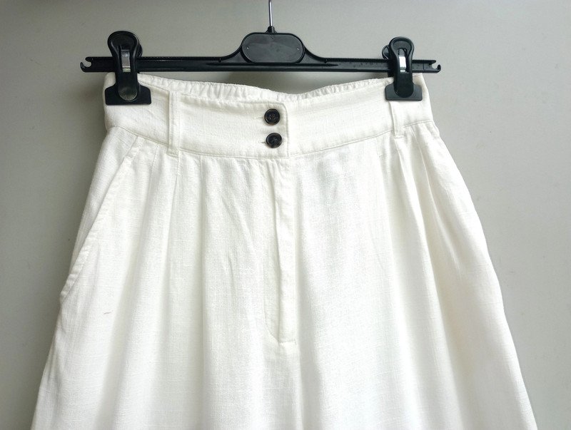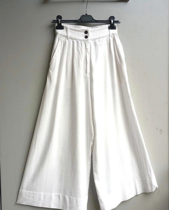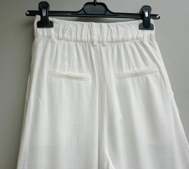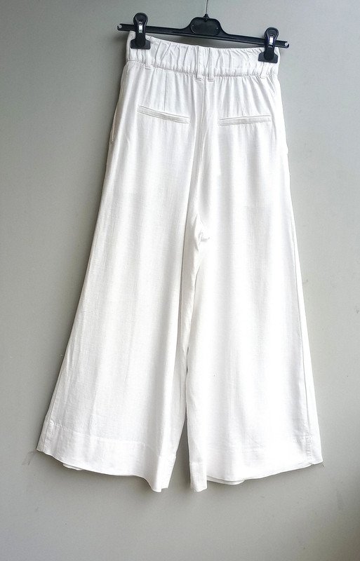 Spodnie typu kuloty z bocznymi kieszeniami. Tylne kieszenie są ślepe. Kolor: mleczna biel