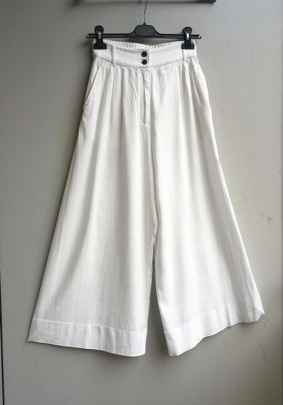Spodnie typu kuloty z bocznymi kieszeniami. Tylne kieszenie są ślepe. Kolor: mleczna biel
