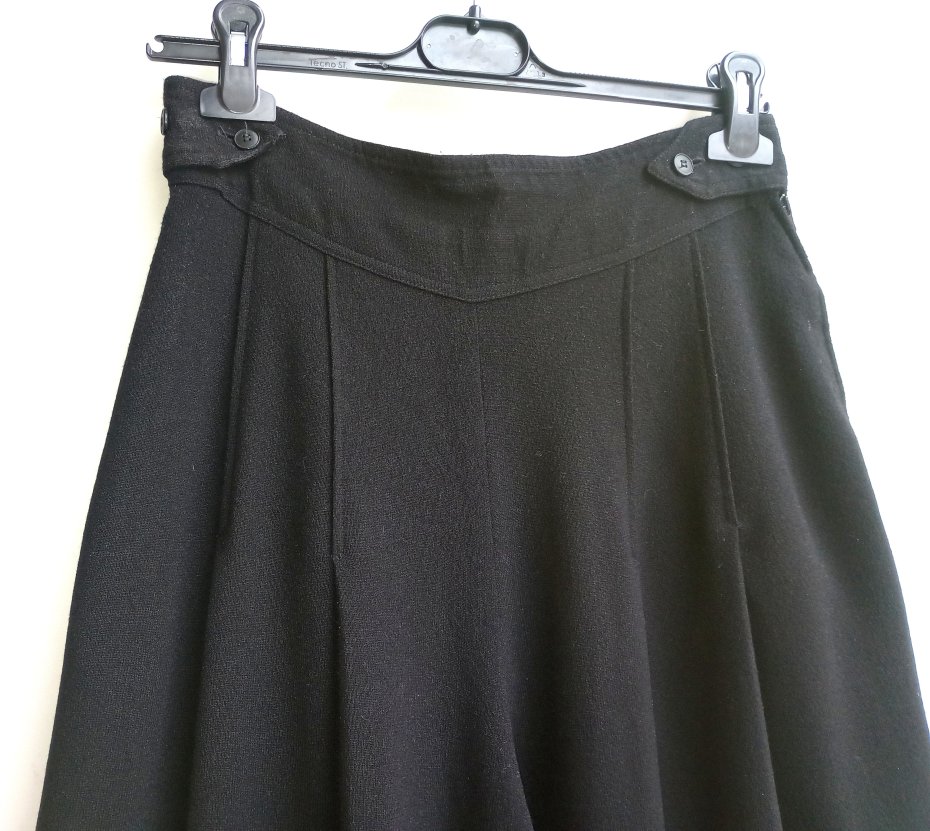 Spodnie kuloty true vintage z miękkiej i dość mięsistej wełny. Dwie boczne kieszenie, boczny suwak. Wysoki stan. Jakość pierwsza klasa. Kolor: głęboka czerń, taka jak na zdjęciu z metką.