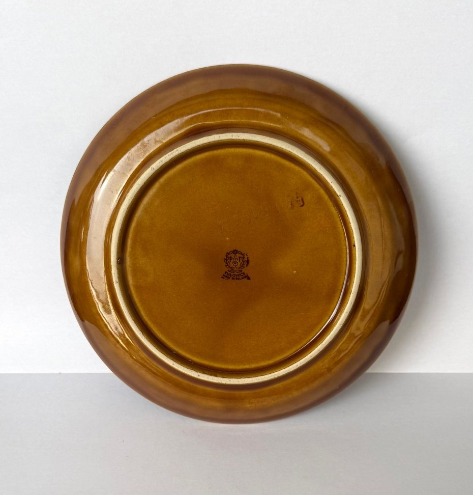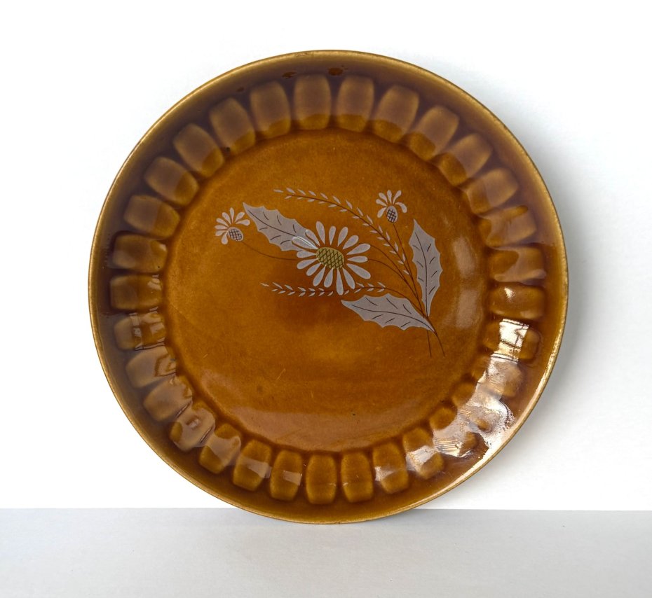To jeden z poszukiwanych wzorów tej wytwórni. Talerz ma wspaniałe, miodowo-karmelowe szkliwo, które gra ze światłem na głębokim, geometrycznym brzegu. Centralnie umieszczona dekoracja przedstawia subtelny bukiet białych stokrotek, naniesiony techniką kalkomanii.