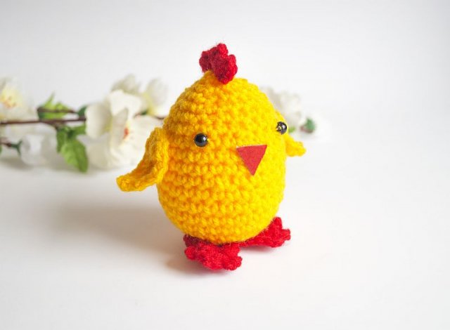 Uroczy, wielkanocny kurczaczek wykonany z mięciutkiej włóczki na szydełku.