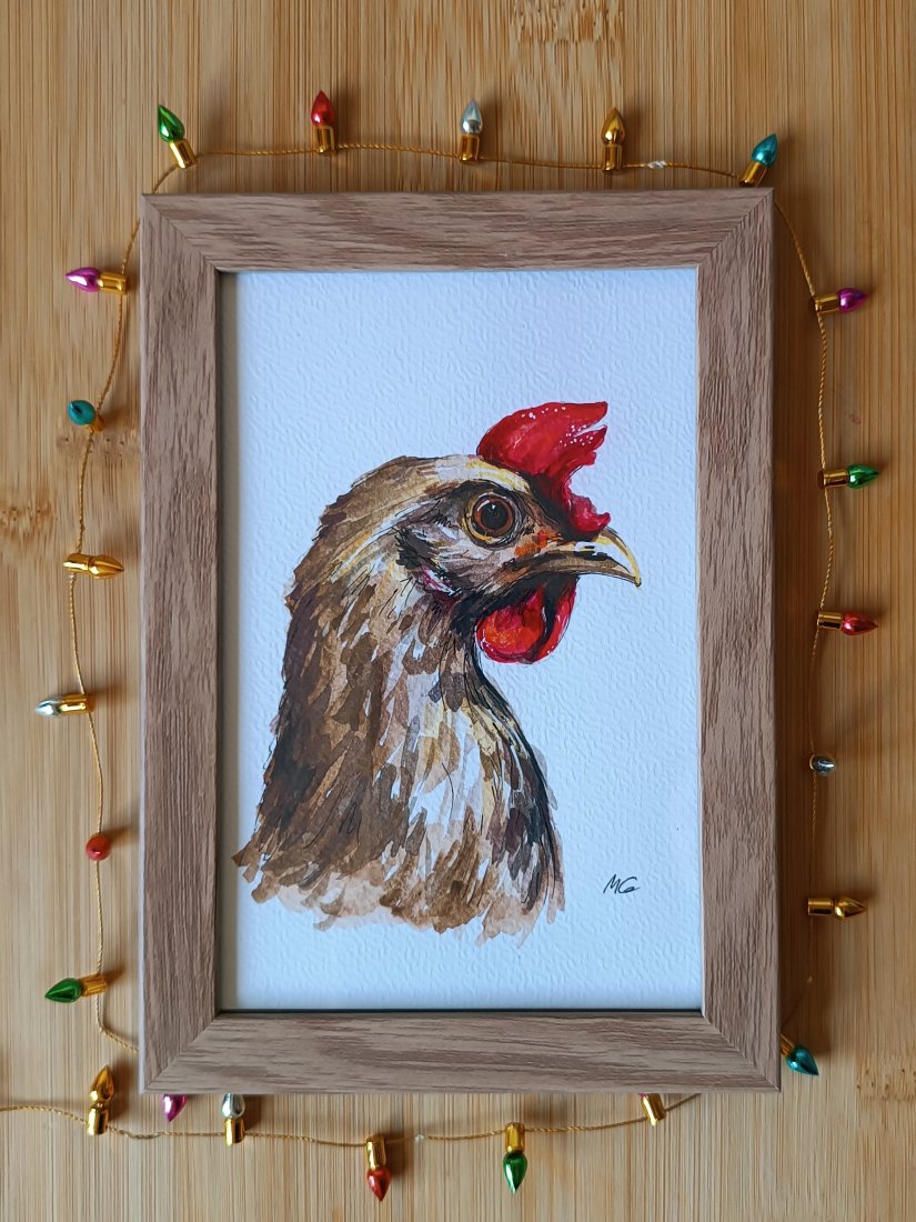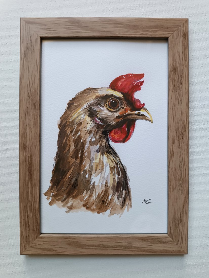 Pani kurka czujnie spogląda co tez ciekawego się dzieje ;-) "Kurka" ręcznie malowana akwarelka na papierze 300g, farbami i tuszami Derwent, z użyciem cienkopisów Winsor & Newton i gellpenu Sakura. Jest to oryginał, oprawiony w ramkę w kolorze jasnego drewna, za szkłem. Wymiary całości 12,2 x 17,4cm. Ramka jest przystosowana również do postawienia. Gotowy prezent! Poleca się w duecie z Kogutem :-)