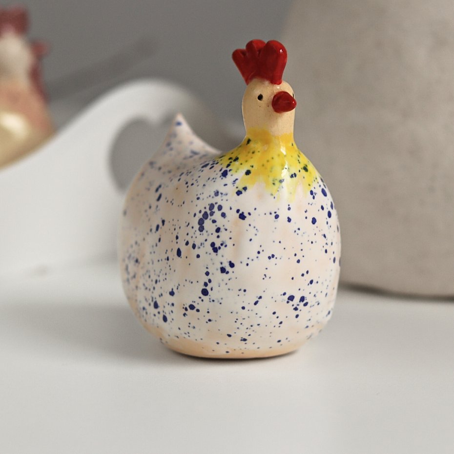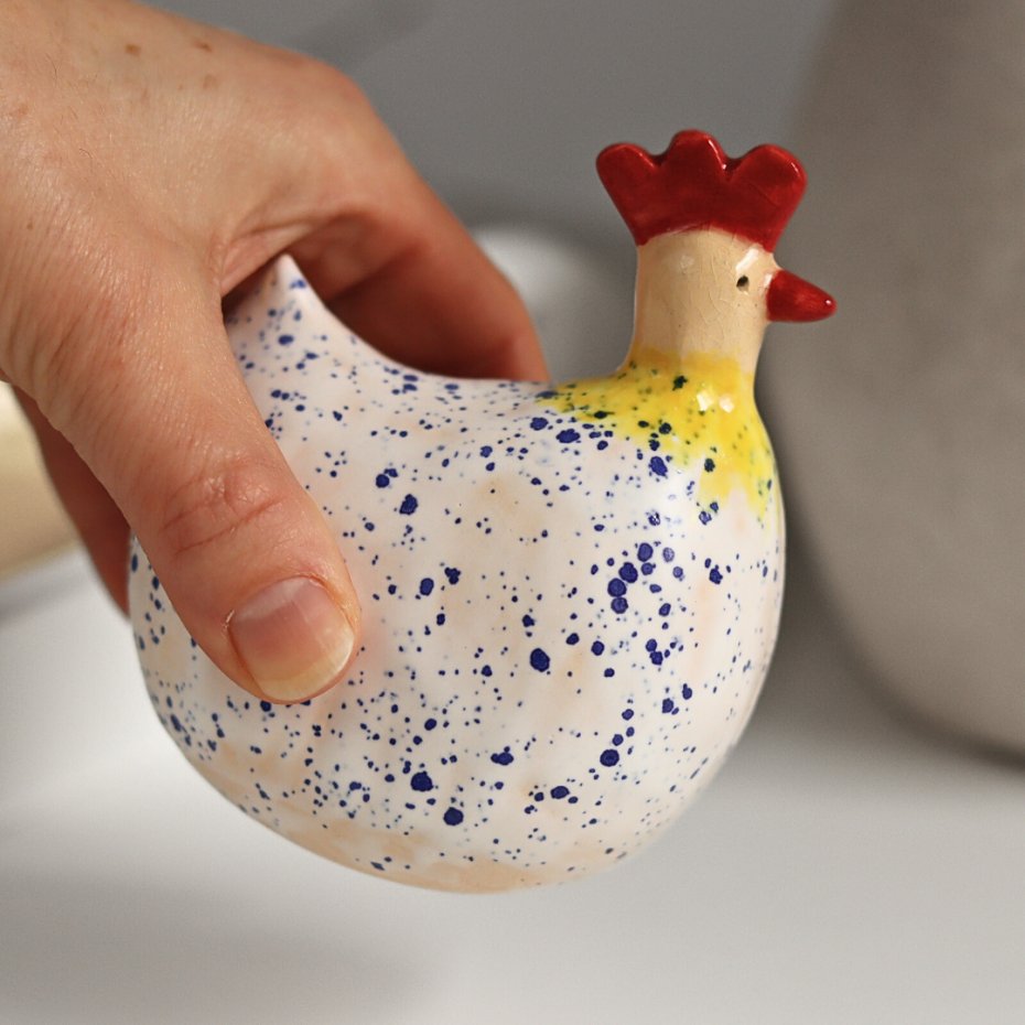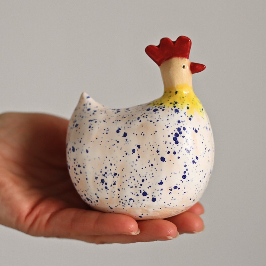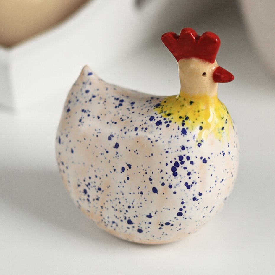 Ręcznie lepiona, bez użycia form ceramiczna kurka wielkanocna. Wykonana z jasnej gliny, lekka, szkliwiona w większości matowym szkliwem.