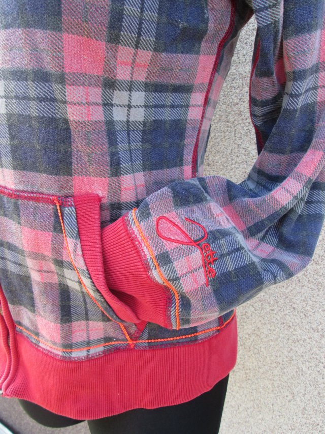 Czerwone przeszycia + haft z logo na rękawie.