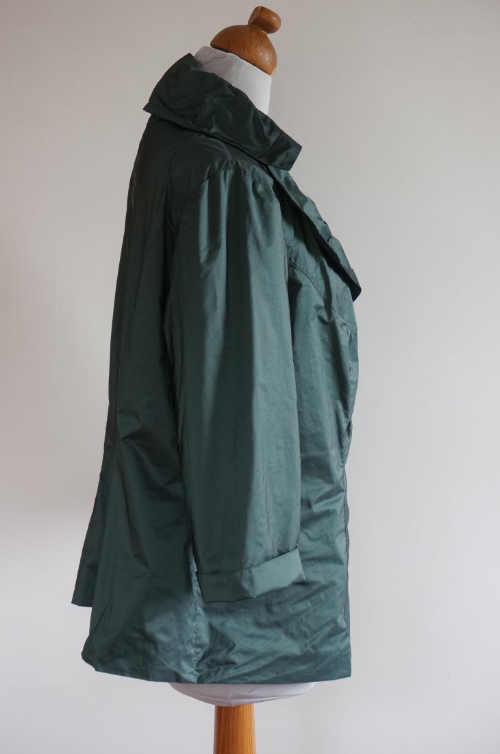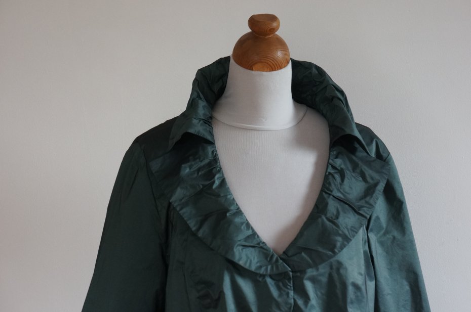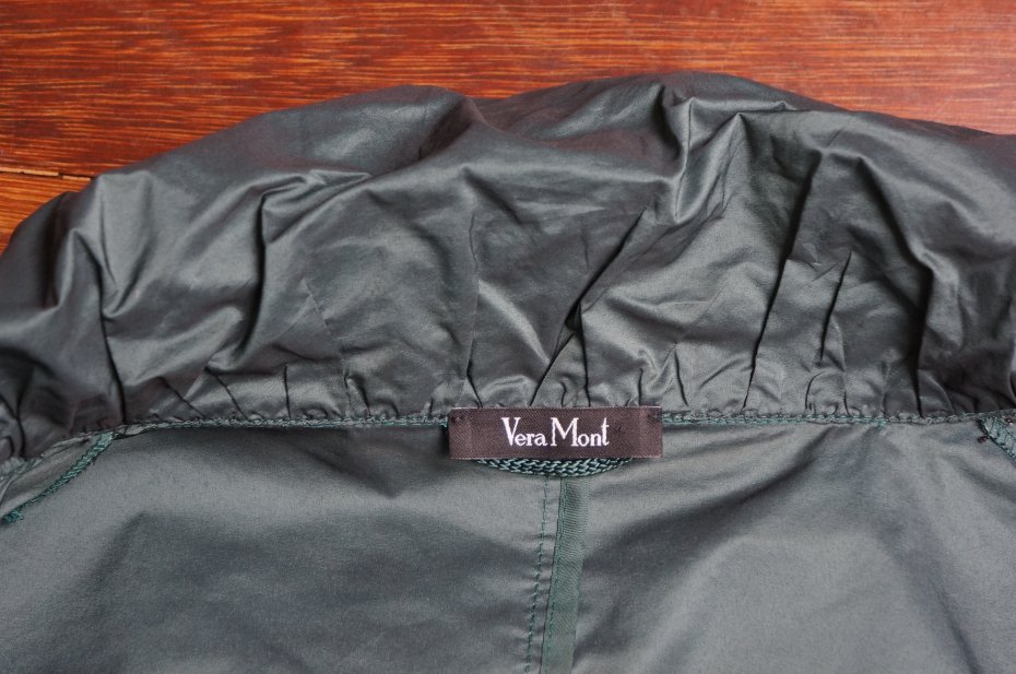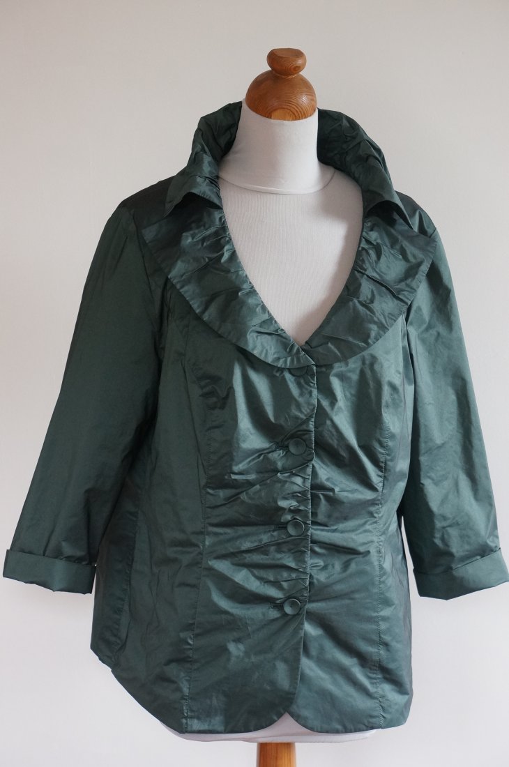 Elegancka kurteczka/marynarka znanej marki Vera Mont.Rękawy ¾ zakończone mankietem. Fantazyjny kołnierz /marszczony/. Guziki obciągnięte tym samym materiałem co wdzianko. Stan bardzo dobry.