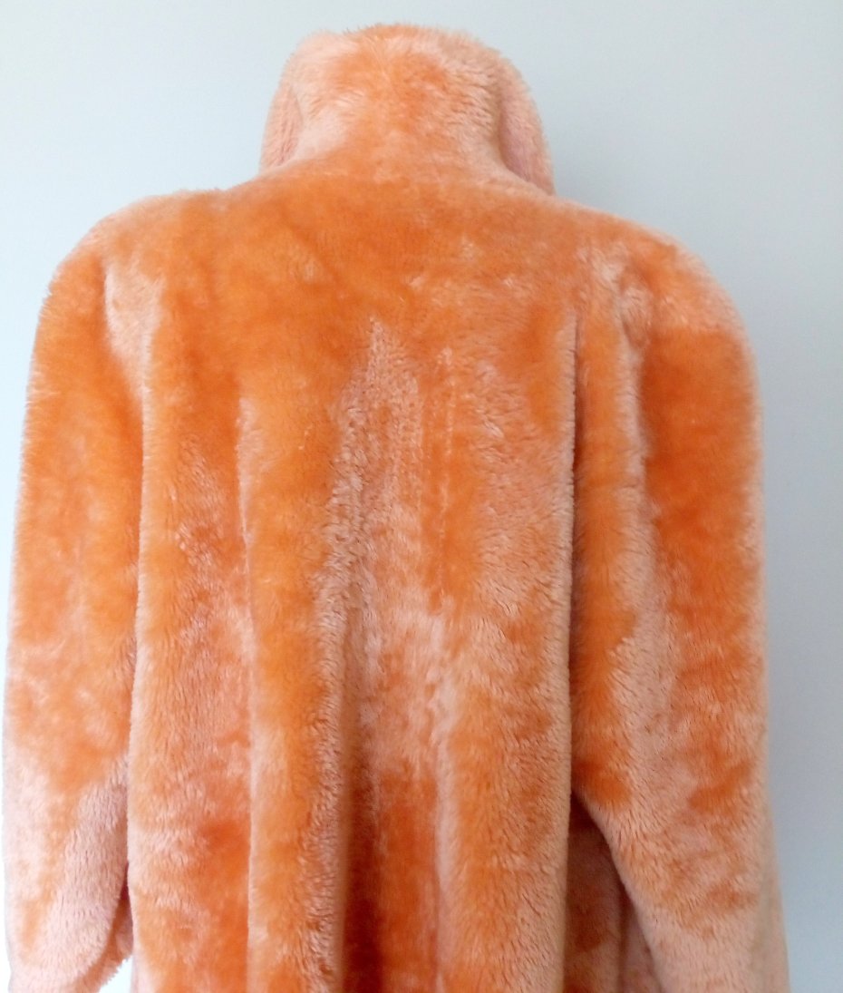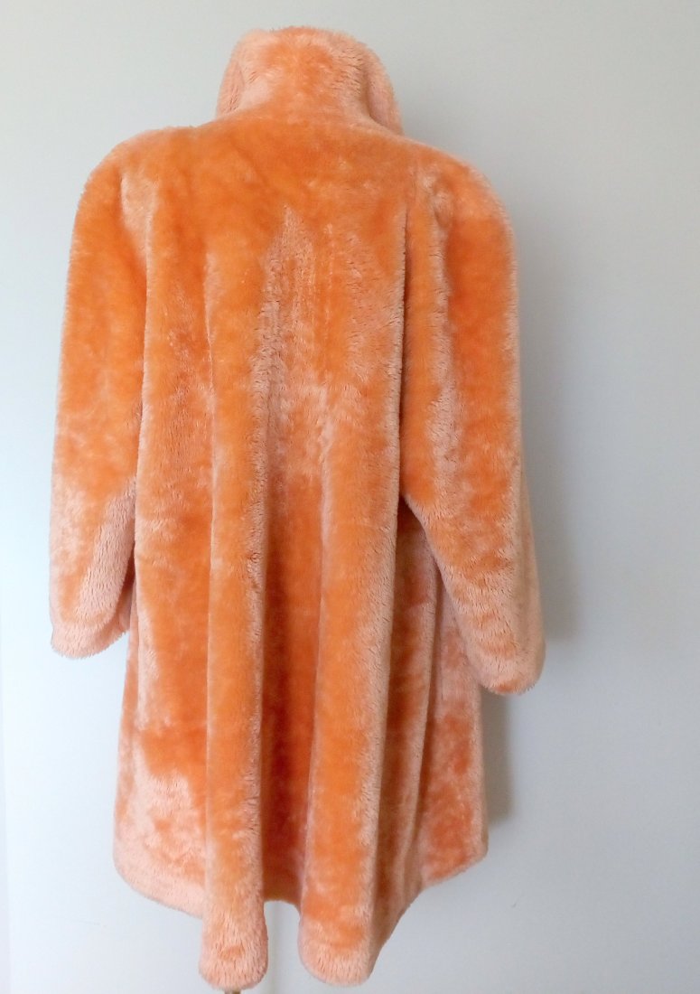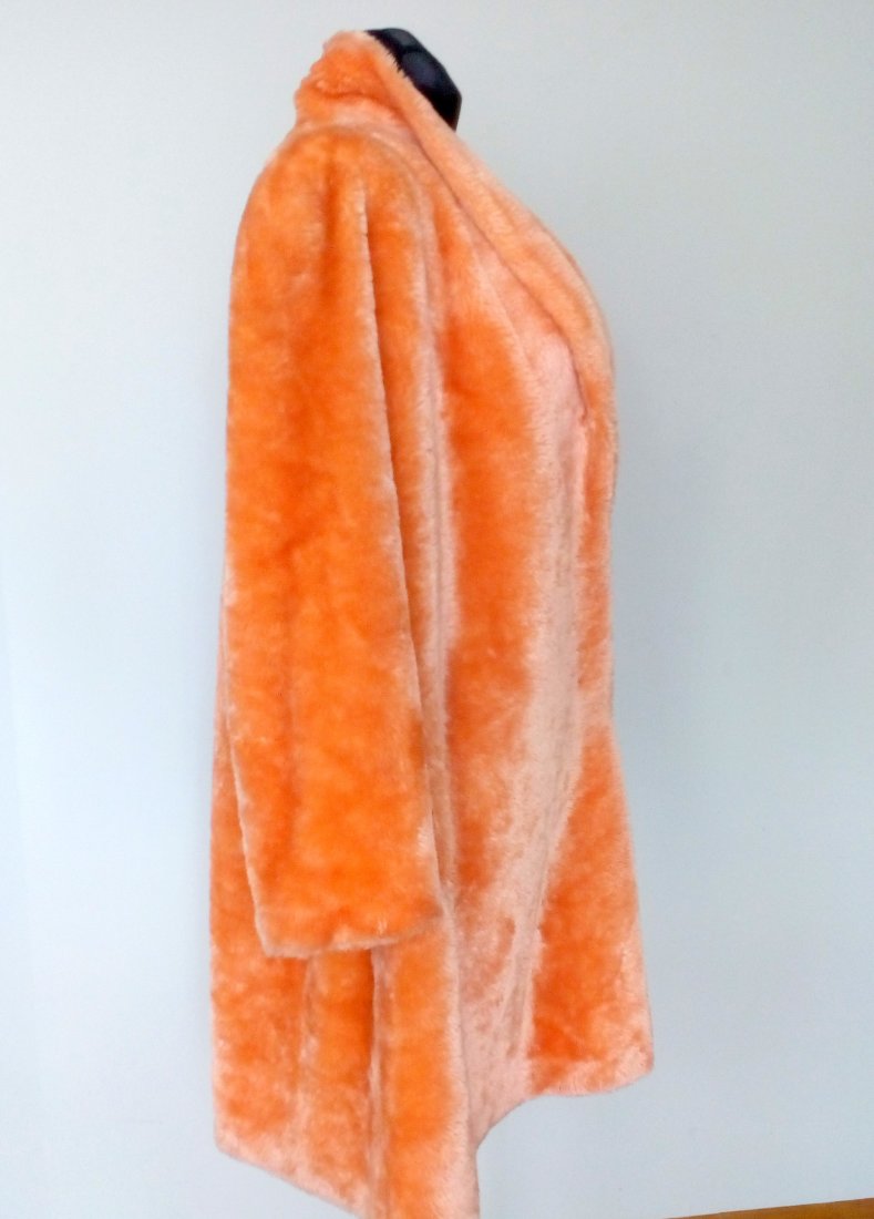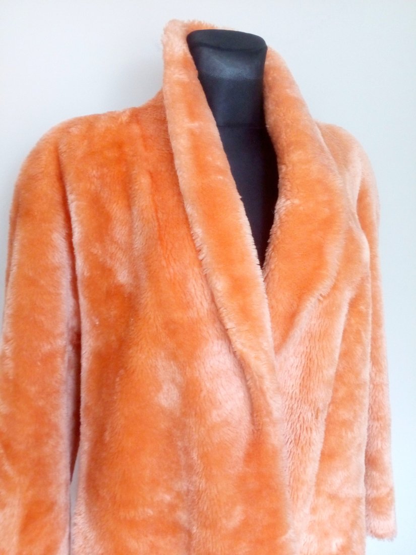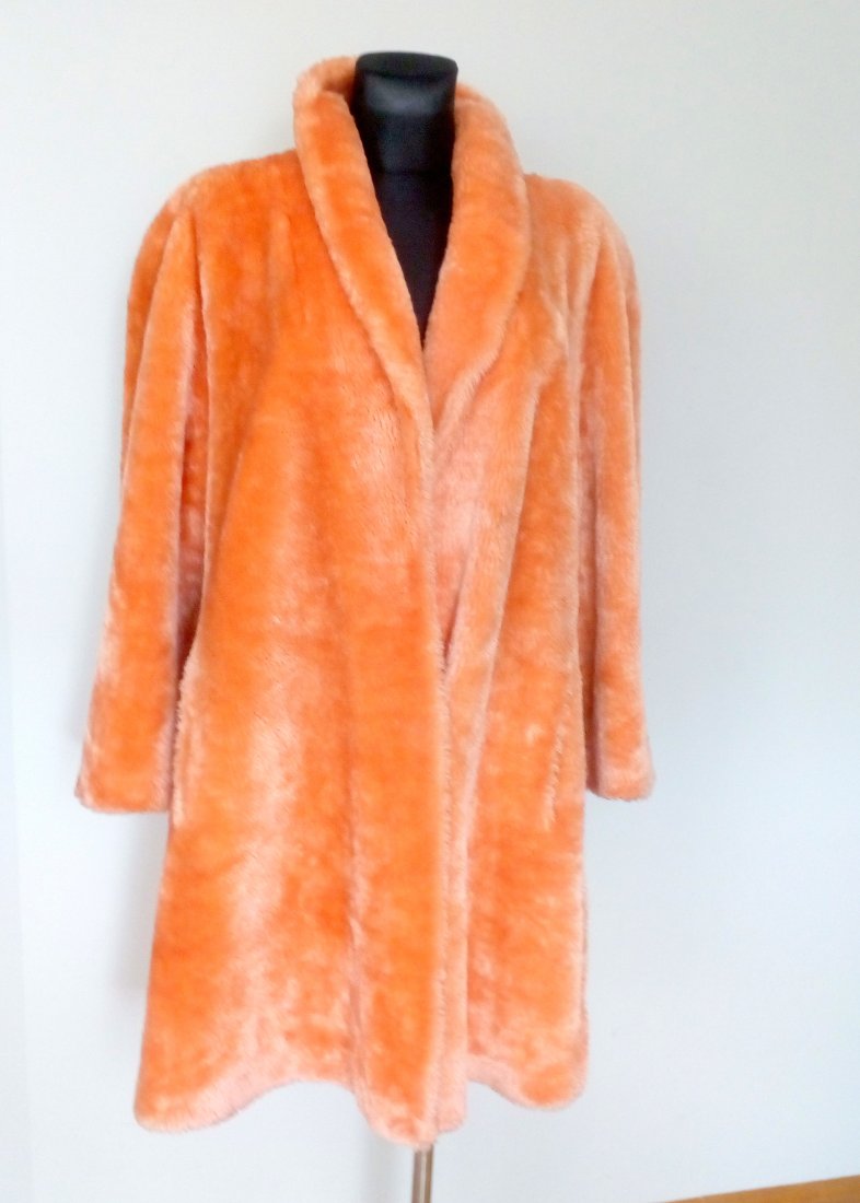 Płaszcz ze sztucznego futerka, kolor morelowy, fason w kształcie litery A, zapinane na dwie mocne haftki, kołnierz szalowy, rękawy raglanowe, z przodu pionowo wpuszczane kieszenie, od środka dopasowana kolorystycznie podszewka