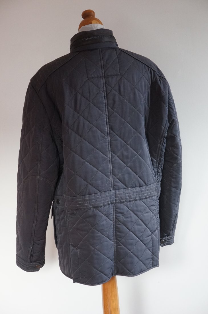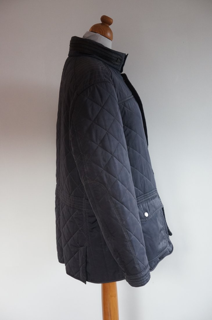 Męska kurtka niemieckiej marki Walbusch. Klasyczne pikowanie w romby odwzorowuje aktualne trendy. Podszewka z polaru. Z przodu trzy naszyte kieszenie zapinane na napy, jedna mała kieszonka zapinana na zamek. Na dole, po bokach kurtki dwie boczne kieszenie z funkcją ogrzewania dłoni. Wewnątrz cztery kieszenie. Kurtka zapinana na zamek i guziki. Cieniutki kaptur w stójce. Kolor - ciemny grafit. Stan bardzo dobry.