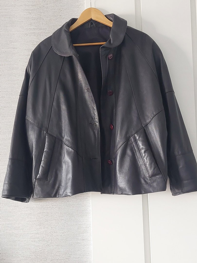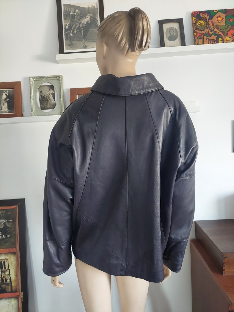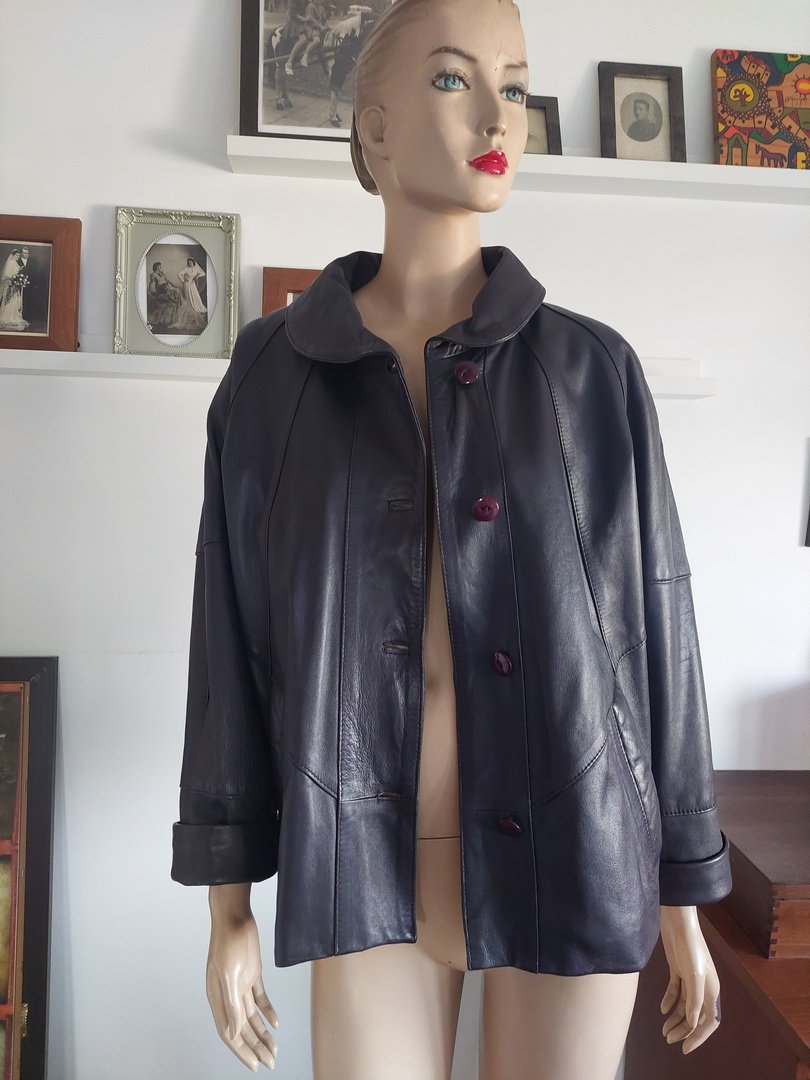 kurtka vintage o fasonie oversize z miękkiej, mięsistej naturalnej skóry. niewielkie ślady normalnego użytkowania (małe punkty), kolor nieoczywisty ciemny szary? z kroplą fioletu? (zależnie od oświetlenia jak bardzo ciemny brąz?) guziki w fioletowo-różowym kolorze, rozmiar z metki 36, ale to fason oversize. kolor proszę sprawdzić wymiary.