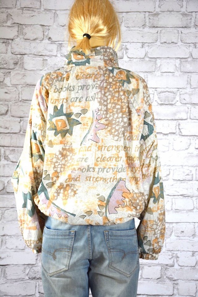 Świetna ortalionowa kurtka w stylu vintage o luźniejszym kroju w pastelowych odcieniach w kolorowe napisy i wzory, zasuwana na suwak , po bokach kieszonki, u dołu możliwość regulacji kurtki dzięki ściągaczowi (sznurek). Posiada podszewkę .