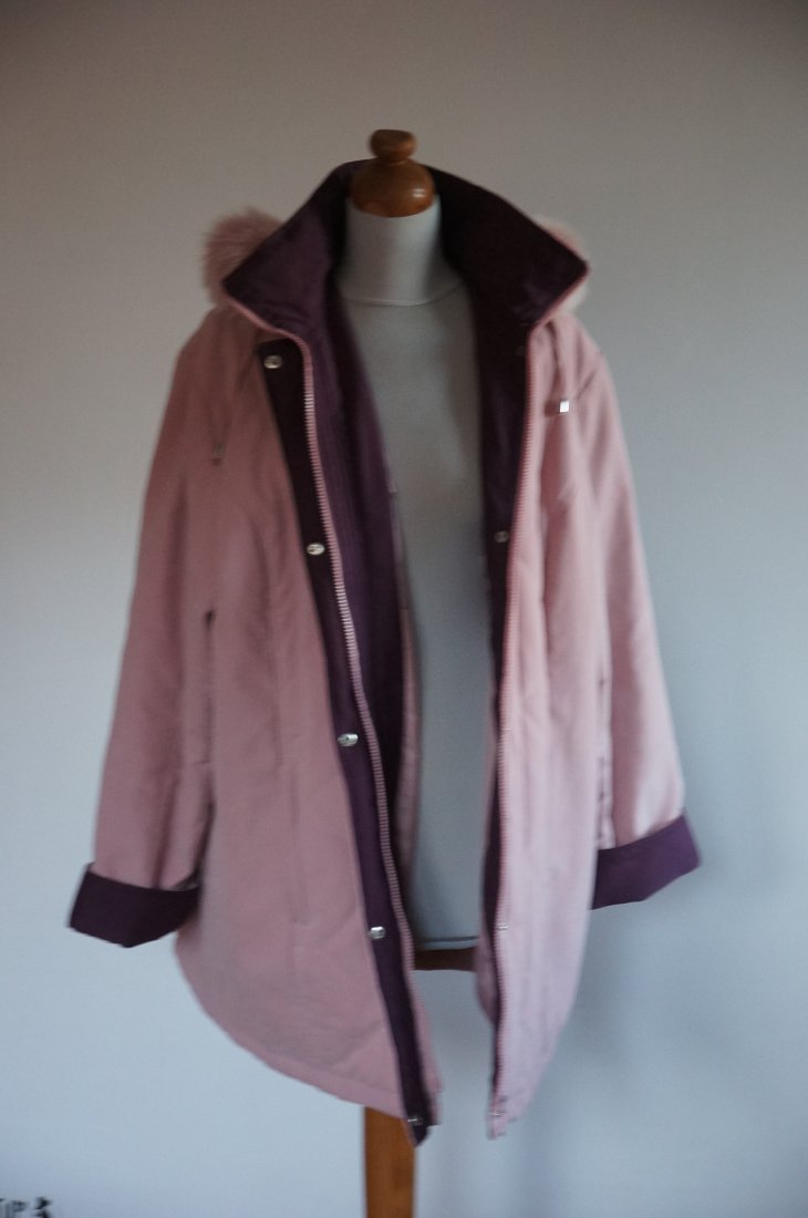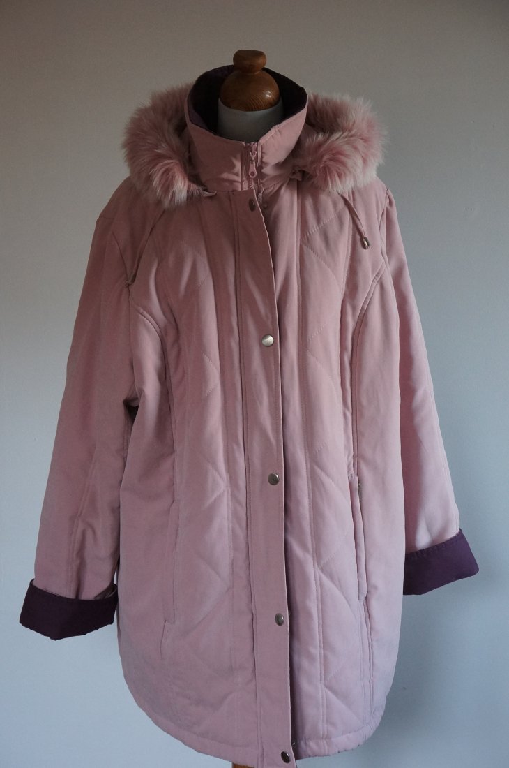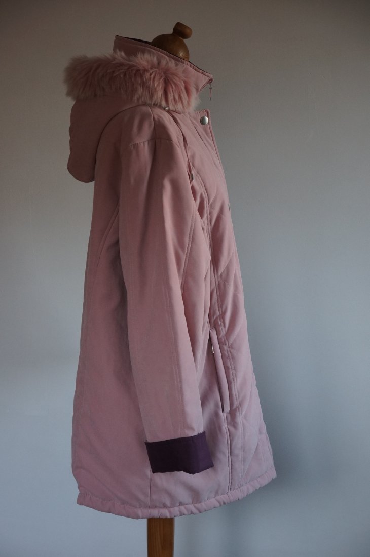 Ocieplana kurtka z kapturem. Kolor pudrowy róż z elementami w kolorze śliwkowym. Kaptur obszyty sztucznym futerkiem. Dwie zewnętrzne kieszenie zapinane na suwak. Wewnątrz jedna kieszonka zapinana na guzik. Kurtka nie jest nowa. Stan BARDZO DOBRY minus.