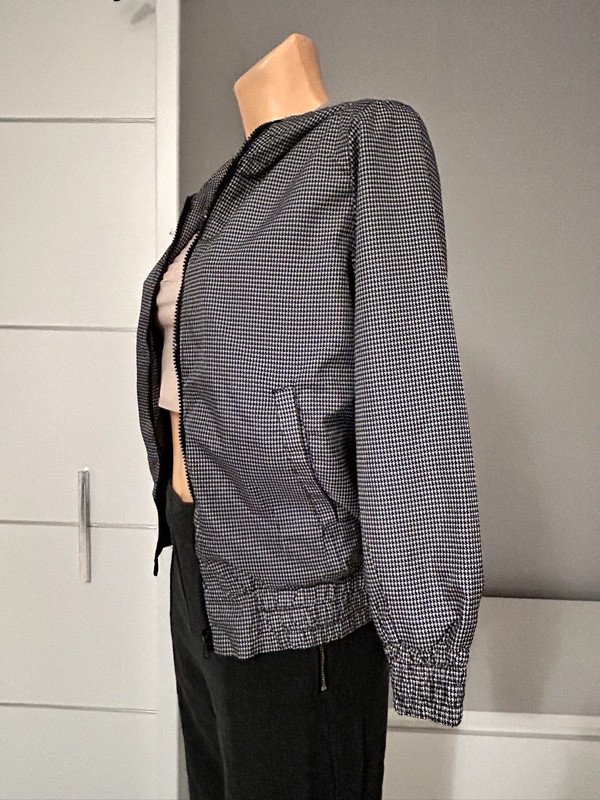 Kurtka posiada drobną kratkę. Jest zasuwana na zamek, rękawy są długości 3/4. Nie posiada metki z rozmiarem, moim zdaniem to XS 34 i S 36. Posiada podszewkę.