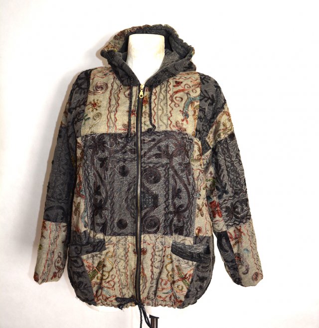 Unikatowa delikatnie ocieplana kurtka o luźniejszym, niezobowiązującym kroju, zasuwana na suwak, z kapturem, z wyhaftowanymi wzorami,po bokach kieszenie,u dołu ściągana, więc jej krój można sobie modelować.Posiada podszewka.