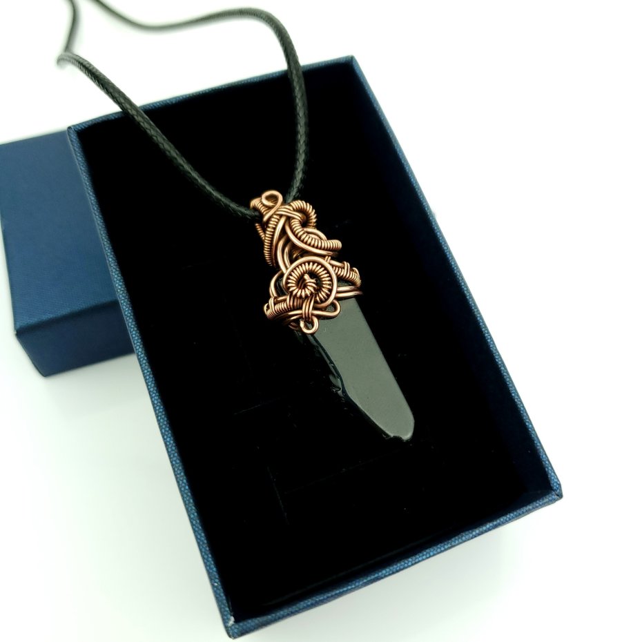 Wisiorek powstał z kwarcu dymnego o nieregularnym kształcie. Całość misternie opleciona miedzią.