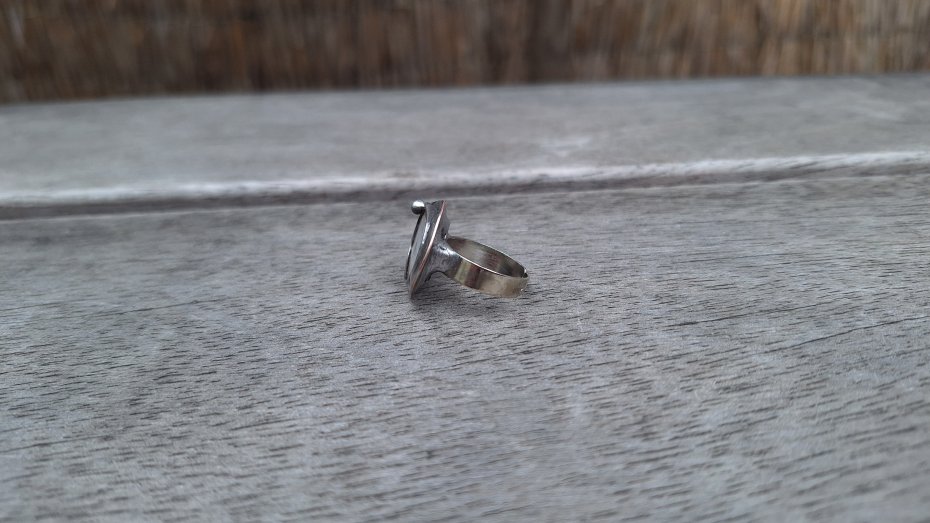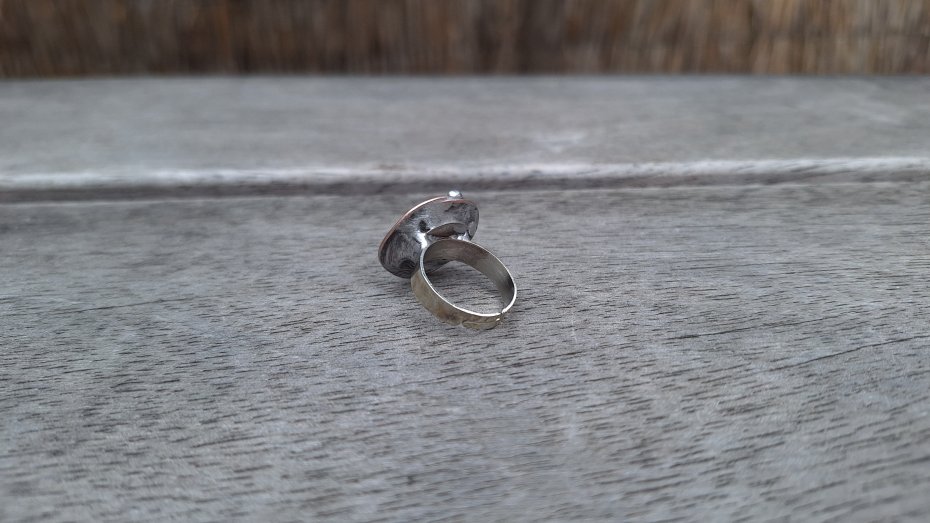 Pierścionek wykonany z miedzi, cyny i kwarcu. Wymiary ok. 1.8 na 1.8 cm. Regulowany. Nie jest ciężki.