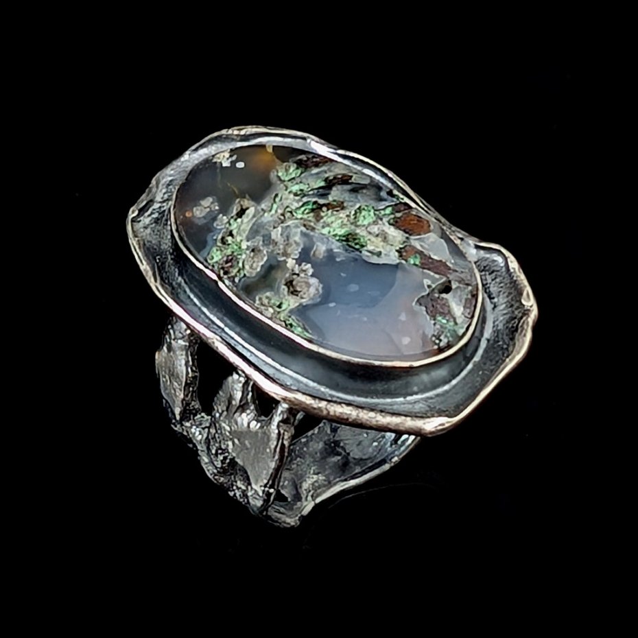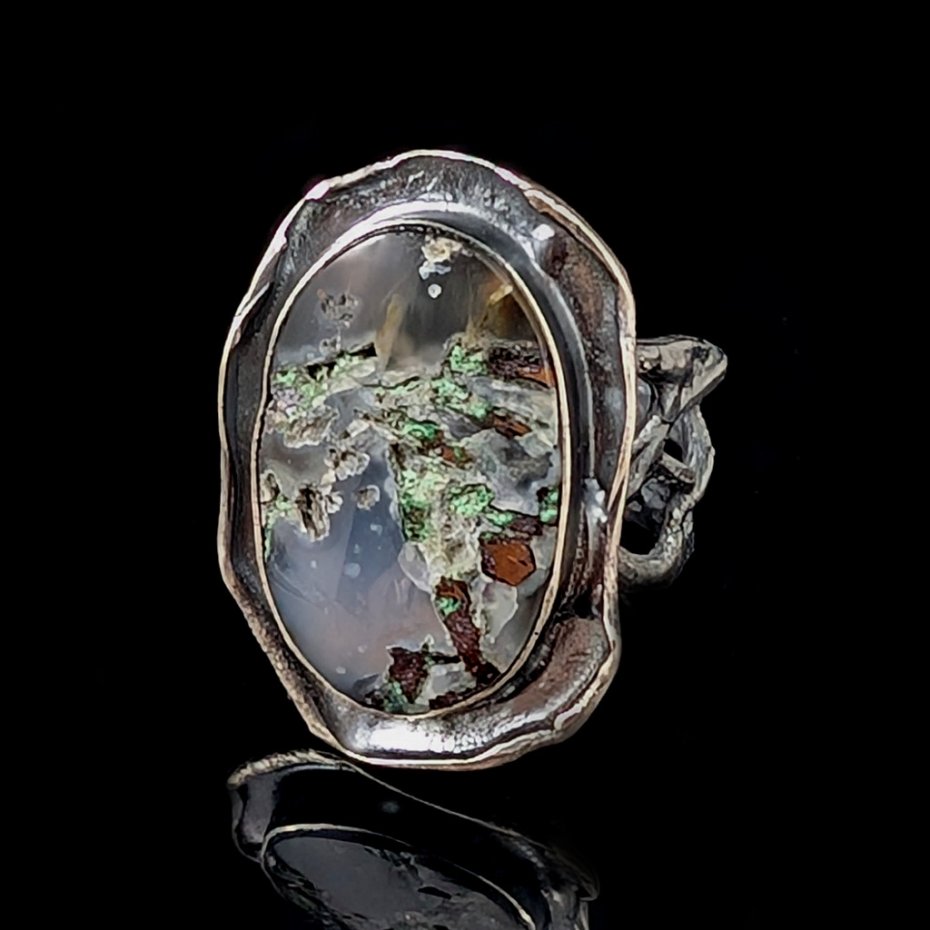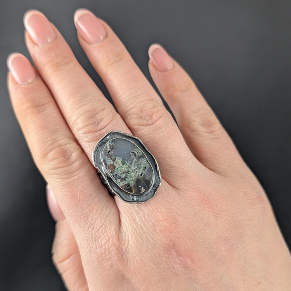 Pierścień z pięknym, unikatowym kwarcem z wrostami miedzi z Indonezji. Kamień oprawiony w oksydowane srebro pr. 925. Niezwykły pejzaż zaklęty w kamieniu. Rozmiar jubilerski pierścionka 17, mogę powiększyć na max 18. Z uwagi na bardzo szeroką, maszywna obrączkę będzie też pasował na 16. Wymiary 30 x 20 mm,, waga 10,7 g, obrączka szer. max 12 mm. Pierścień będzie zapakowany w ozdobne pudełeczko.