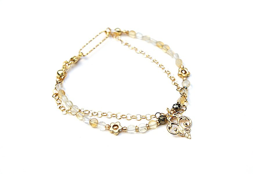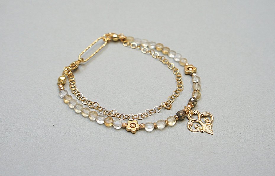 Delikatna bransoletka wykonana w całości ze stali szlachetnej pozłacanej oraz naturalnych, szlachetnych kamieni - fasetowanych monetek kwarcu lemon [śr. 4mm], fasetowanych kuleczek pirytu [3,5mm], przekładek z hematytu. Całkowita długość bransoletki: ok. 19cm.
