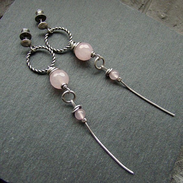 Kobiece, długie i oryginalne kolczyki na co dzień i nie tylko. Wykonane w całości z oksydowanego srebra próby 925 oraz fasetowanych i gładkich kulek różowego kwarcu wielkości 8 i 4 mm. Na życzenie mogę wykonać podobe kolczyki z inymi kaminiami:) Całkowita długość kolczyków to ok. 7,5 cm. Ozdobnie zapakowane.