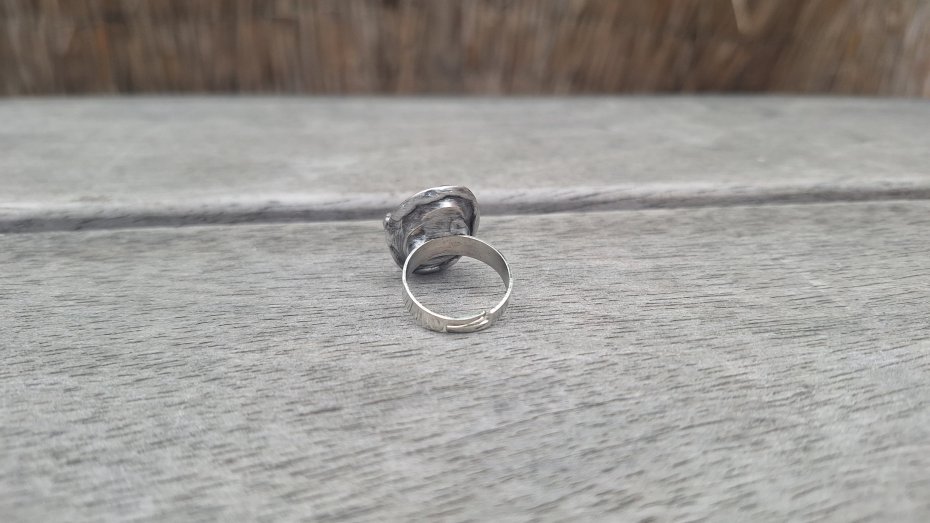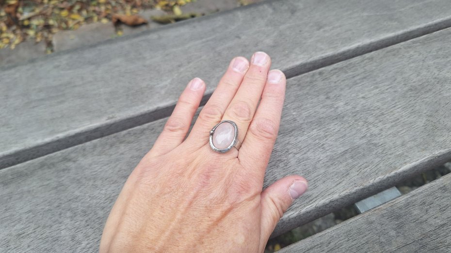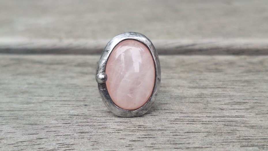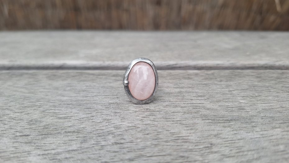 Pierścionek wykonany z miedzi, cyny i różowego kwarcu. Wymiary ok. 2 na 1,5 cm. Regulowany.