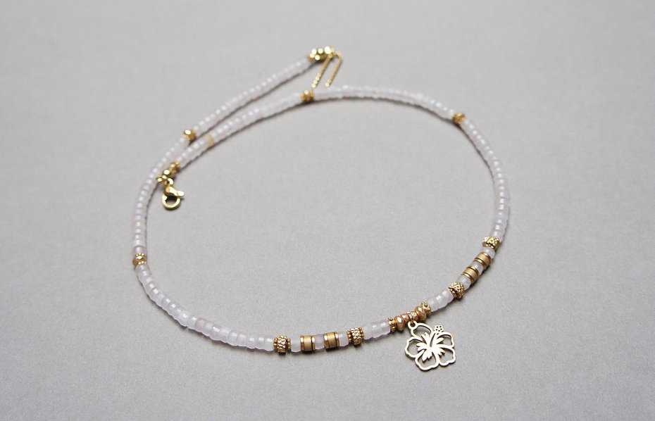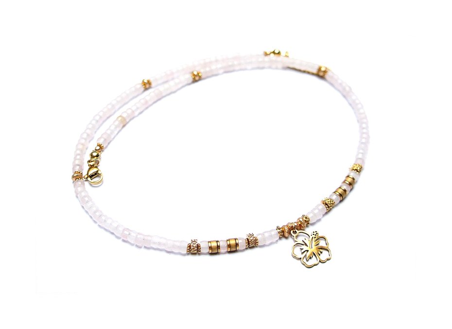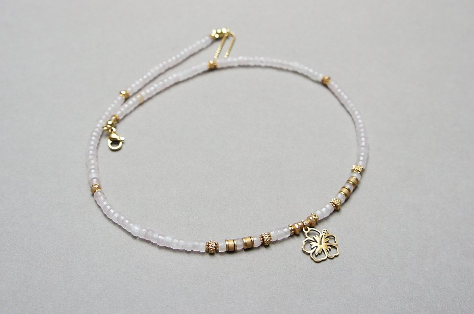 Krótki, delikatny naszyjnik wykonany w całości z pozłacanej stali szlachetnej oraz naturalnych kamieni - talarki fasetowane kwarcu różowego [4 x 2mm], talarki matowego hematytu [4 x 2mm], oponek fasetowanego hematytu [4 x 2mm; 3 x 2mm], przekładek z hematytu [2mm]. Naszyjnik o długości ok. 43cm. Biżuteria ozdobnie zapakowana.