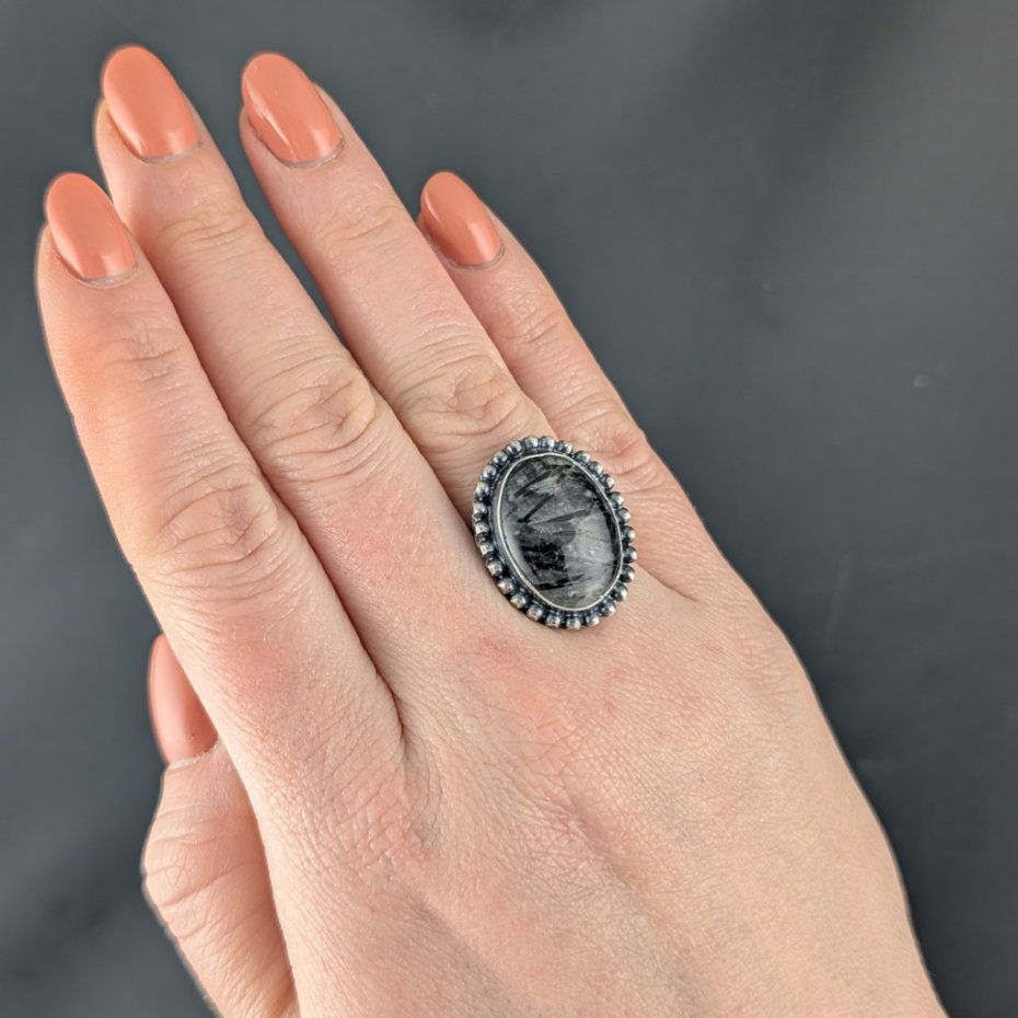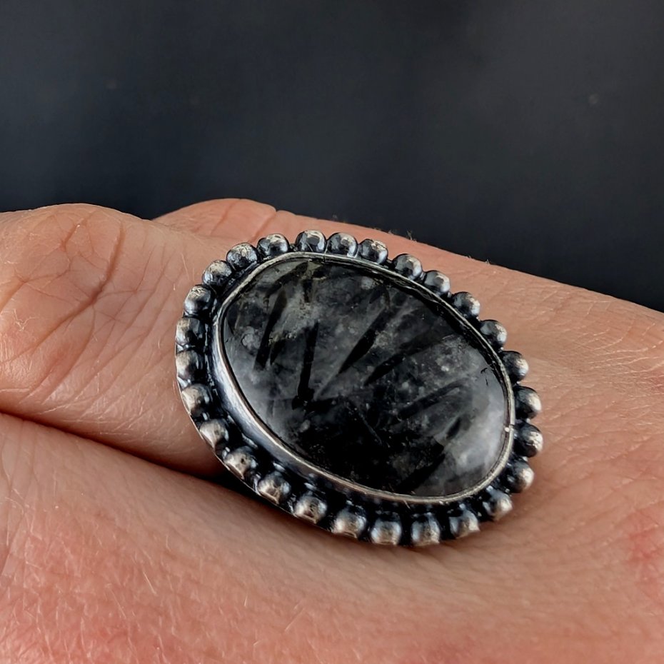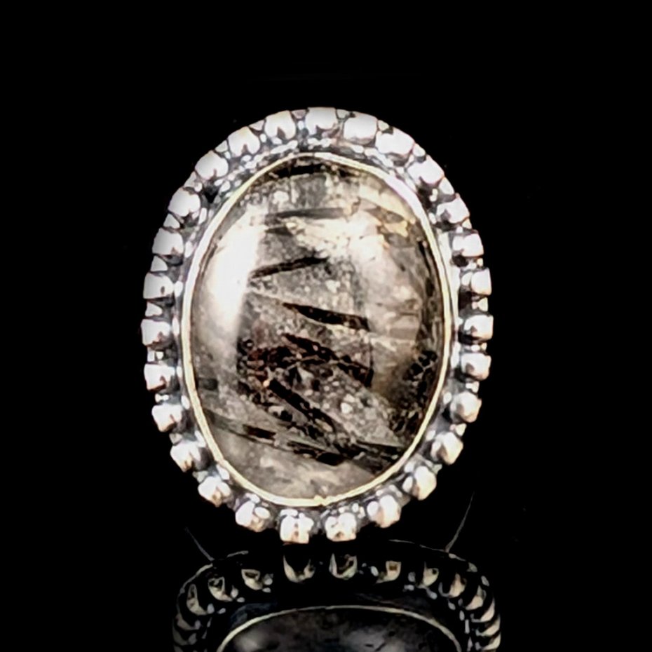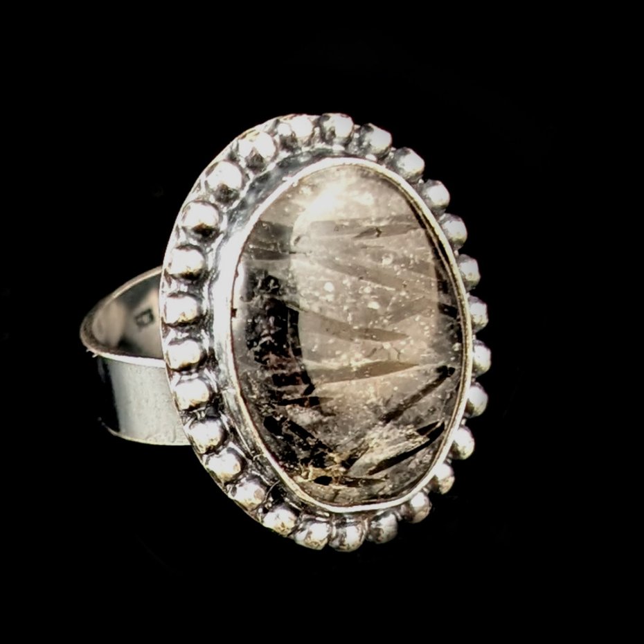 Okazały pierścień z ciekawym kwarcem z inkluzjami czarnego turmalinu. Wymiary oprawy kamienia 25 x 20 mm, rozmiar jubilerski regulowany w szerokim zakresie. Waga 9,4 g, Pierścionek zostanie zapakowany w ozdobne pudełeczko.