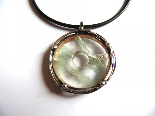 Wisiorek wykonany z miedzi, cyny i kwarcu. Zawieszony na czarnej lince kauczukowej o długości ok. 45 cm. Średnica ok. 4,4 cm.