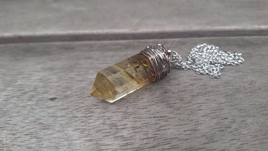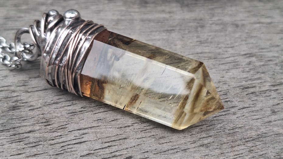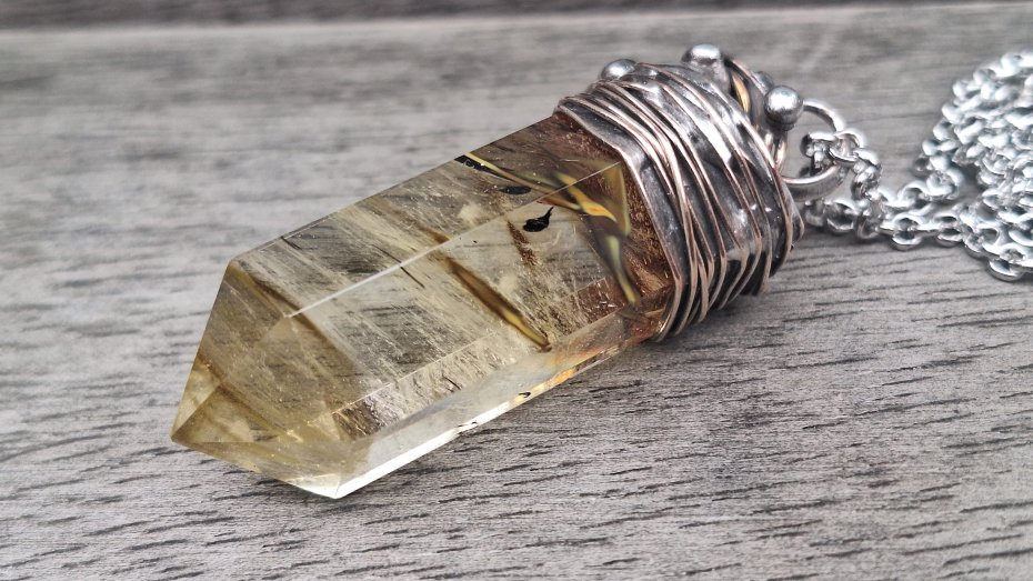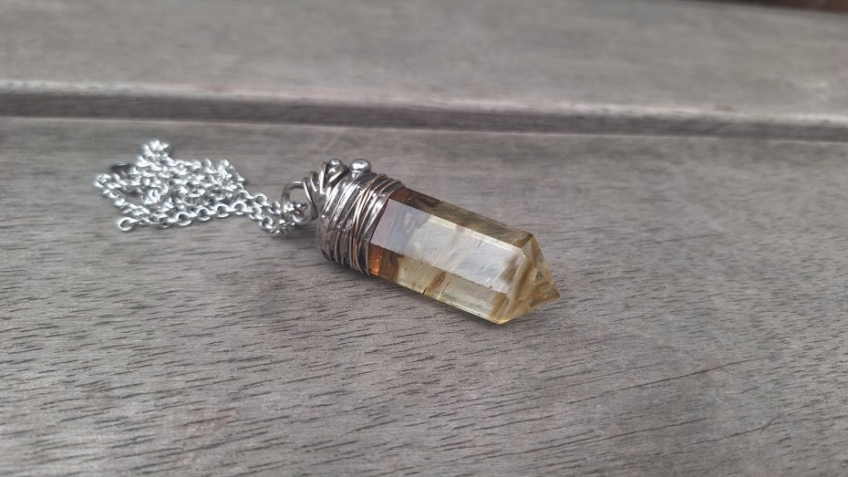 Wisiorek wykonany z miedzi, cyny i kwarcu. Wymiary ok. 5.5 na 1.8 cm. Zawieszony na łańcuszku o długości ok. 50 cm.