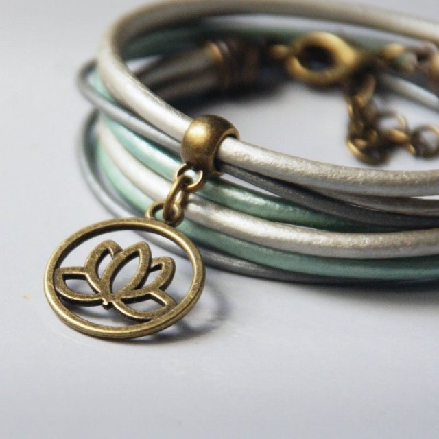 POMYSŁ NA PREZENT ;-) delikatna bransoletka wykonana z 4 rzemieni ze 100% skórki naturalnej w odcieniach metalicznych/perłowych (po 2 rzemienie 3mm i 2mm) zawieszka (KWIAT LOTOSU - symbol PIĘKNA, DELIKATNOŚCI, IDEAŁU) i wykończenie w kolorze antycznego złota. długość regulowana za pomocą łańcuszka. BRANSOLETKA PASUJE NA NADGARSTEK OD 14,5CM. możesz ją nosić samodzielnie lub dowolnie łączyć z innymi bransoletkami z tej serii. świetnie prezentuje się też w zestawieniu z bransoletkami z kamieni naturalnych. ZOBACZ CAŁĄ KOLEKCJĘ!!! ... MOJA BIŻU ZAWSZE PODRÓŻUJE OZDOBNIE ZAPAKOWANA ;-) ...