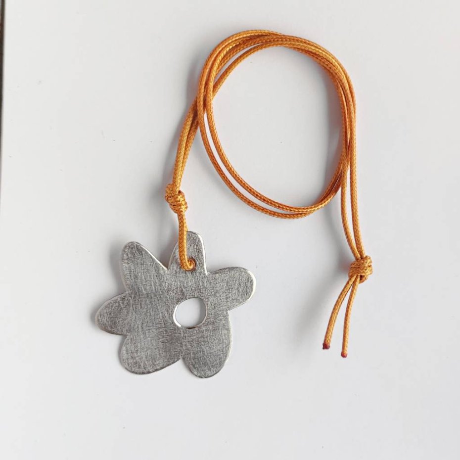 Efektowny, nowoczesny, a zarazem romantyczny dodatek. KWIAT to uroczy i delikatny wzór. W wyjątkowy sposób łączy on ażur z metalem, który przyciąga wzrok jak mało która ozdoba. Wisiorek wykonany jest z -alpaki, ozdobny sznurek. Alpaka : zmatowiona. Długość sznurka – 70 cm. Długość zawieszki – 5,2cm. Szerokość zawieszki – 4,8cm.