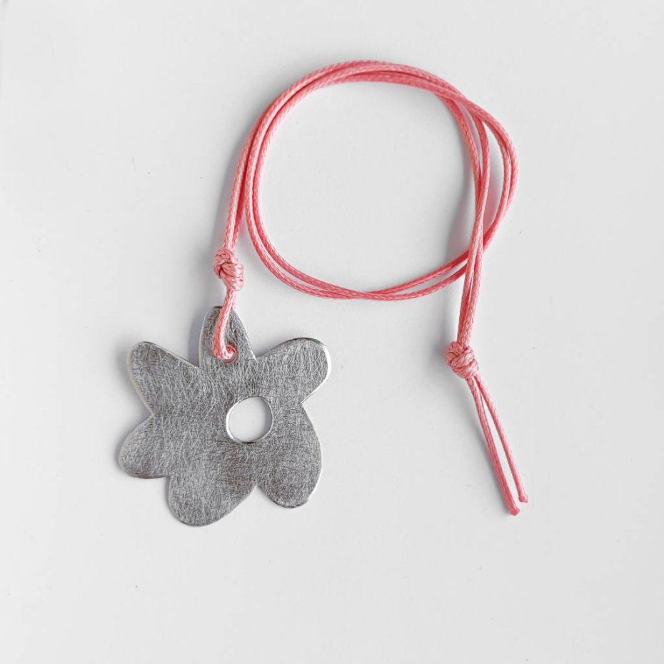 Efektowny, nowoczesny, a zarazem romantyczny dodatek. KWIAT to uroczy i delikatny wzór. W wyjątkowy sposób łączy on ażur z metalem, który przyciąga wzrok jak mało która ozdoba. Wisiorek wykonany jest z -alpaki, ozdobny sznurek. Alpaka : zmatowiona. Długość sznurka – 70 cm. Długość zawieszki – 5,2cm. Szerokość zawieszki – 4,8cm.