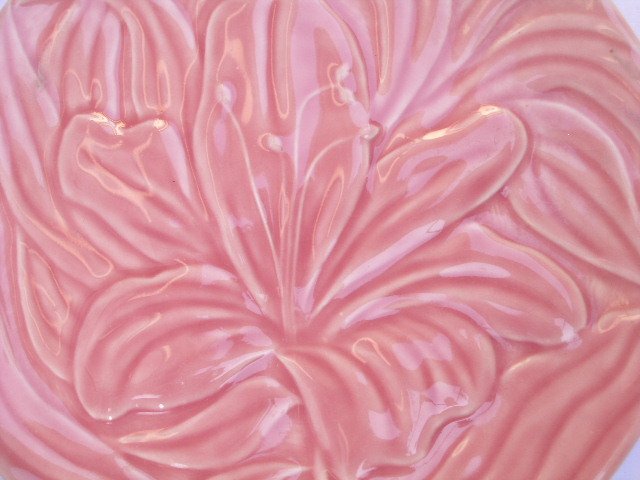 Dekoracyjny i pięknie różowy, kwiatem artystycznie ryflowany talerzyk-obrazek porcelanowy, sygnowany, portugalski. Błyszczące szkliwienie i charakterystyczne kraklowanie. 20 x 1,2 cm. Pod górnym prawym języczkiem od uchwytu do powieszenia wada w postaci odprysku szkliwa. Stan zachowania dobry.