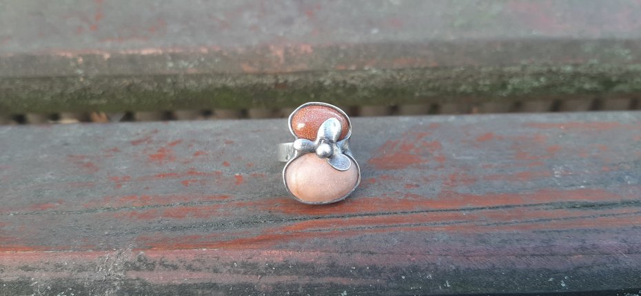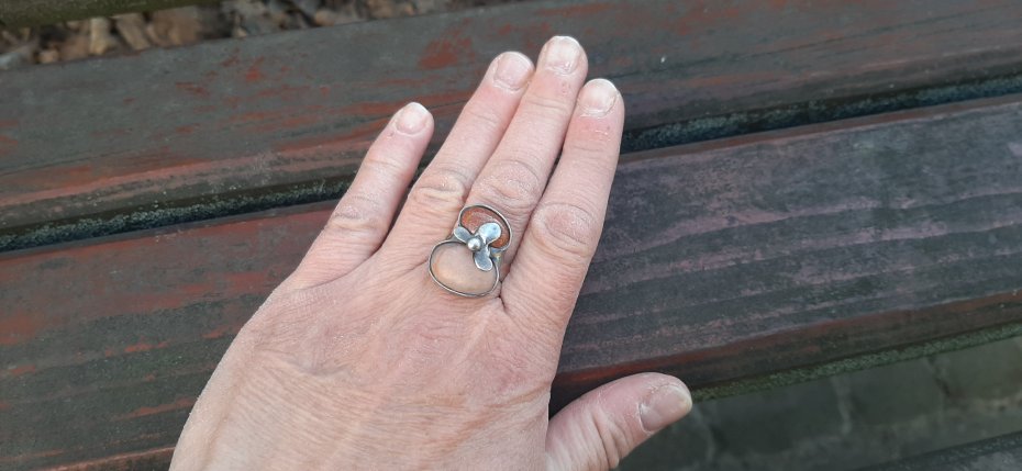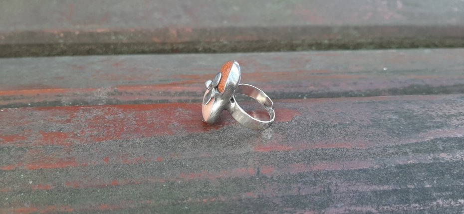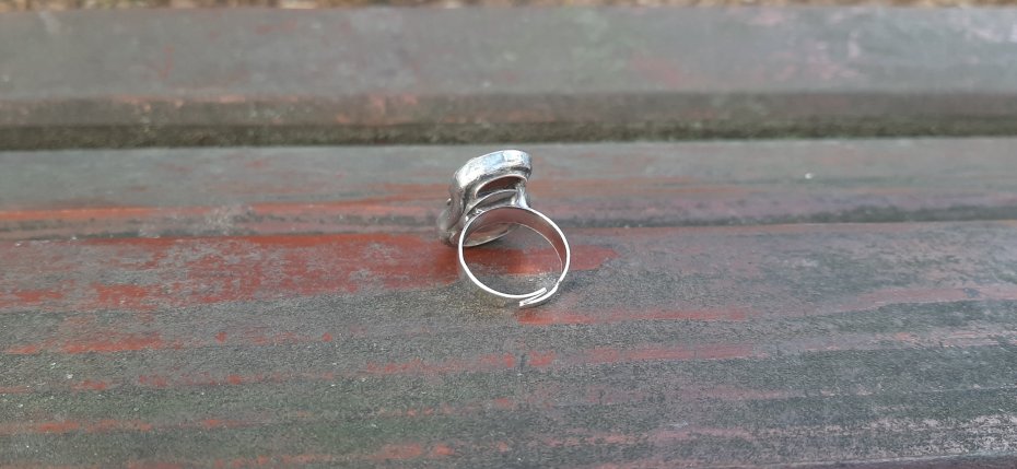 Pierścionek wykonany z miedzi, cyny, jaspisu i szkła. Wymiary ok. 2.2 na 1.7 cm. Regulowany. Nie jest ciężki.