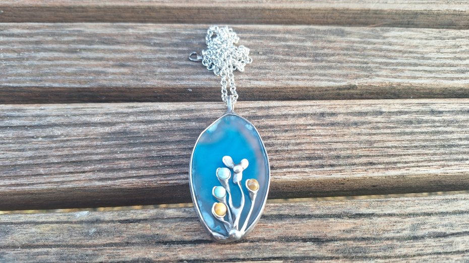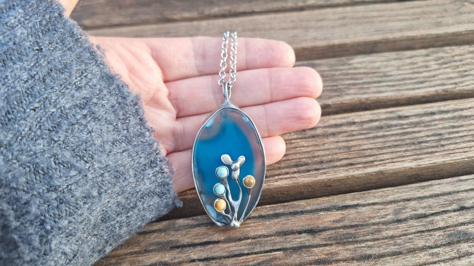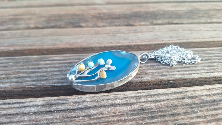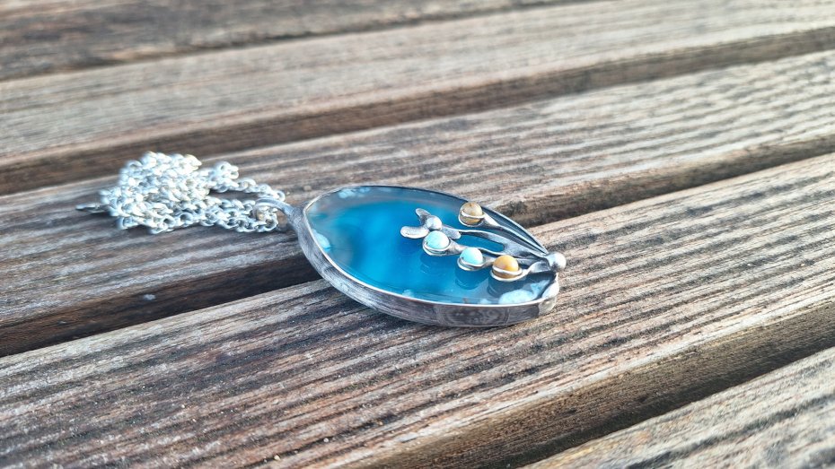 Wisiorek wykonany z miedzi, cyny, amazonitów, tygrysiego oka i agatu. Wymiary ok. 5 na 3 cm. Zawieszony na łańcuszku o długości ok. 50 cm.